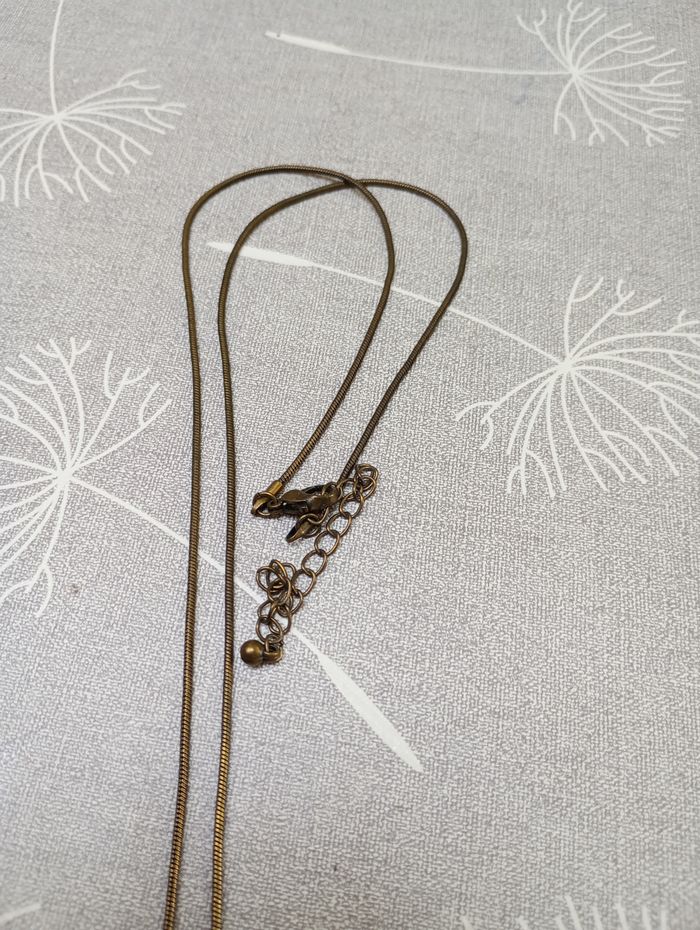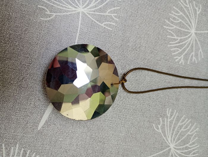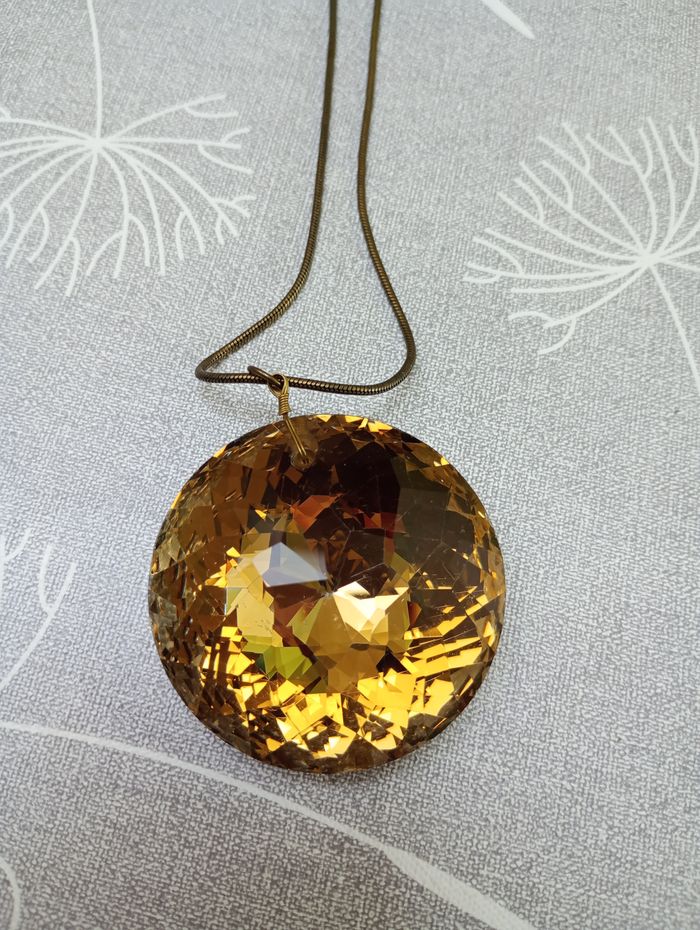 Collier avec grosse pierre jaune. Longueur : 47 cm. Pierre : 4,5 cm. Léger éclat sur le bas qui se voit très peu.