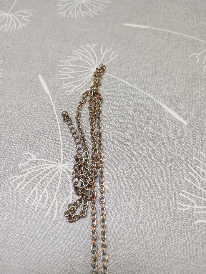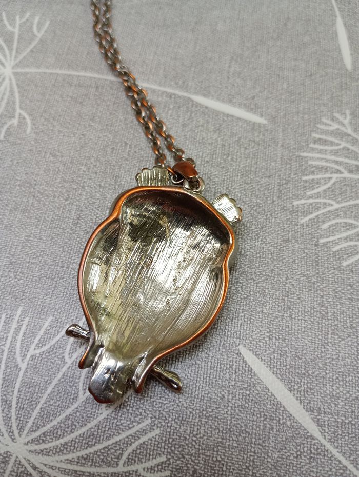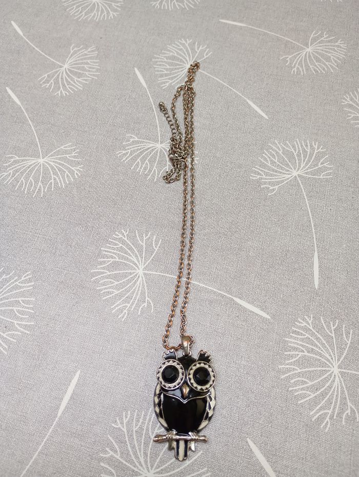 Long collier avec un hibou noir et blanc. Longueur : 48 cm. Hibou : 5,5 cm. Très bon état.