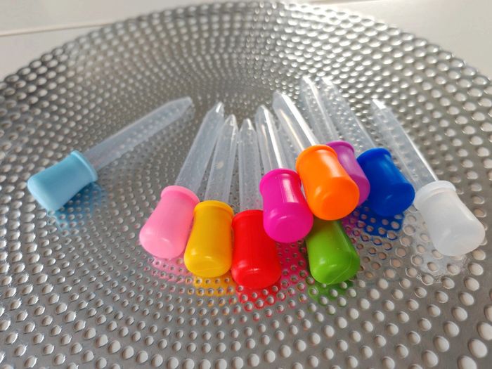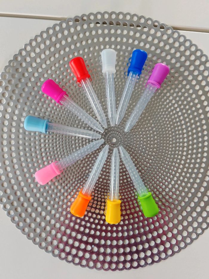 Lot de 10 pipettes colorés de 5ml, elles sont gradués à chaque ml. Ideal pour des activités de motricité fine et sensoriel avec les jeunes enfants. Prise en main facile pour les petites mains de nos scientifiques en herbe. Neuf #marion70270jouet
