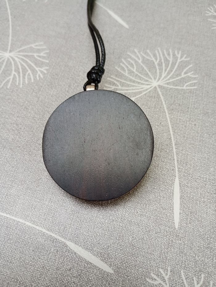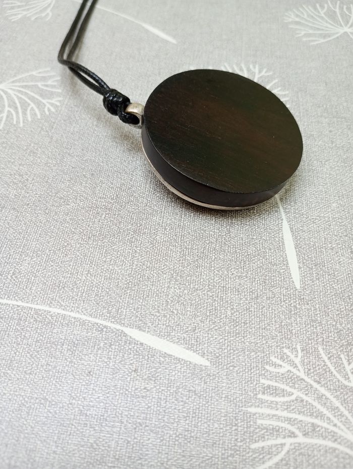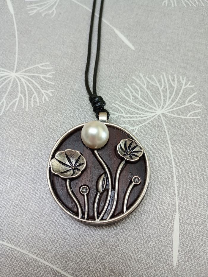 Collier avec pendentif rond en bois avec fleurs et perle en relief. Longueur : 50 cm. Pendentif : 5 cm de diamètre. Très bon état.