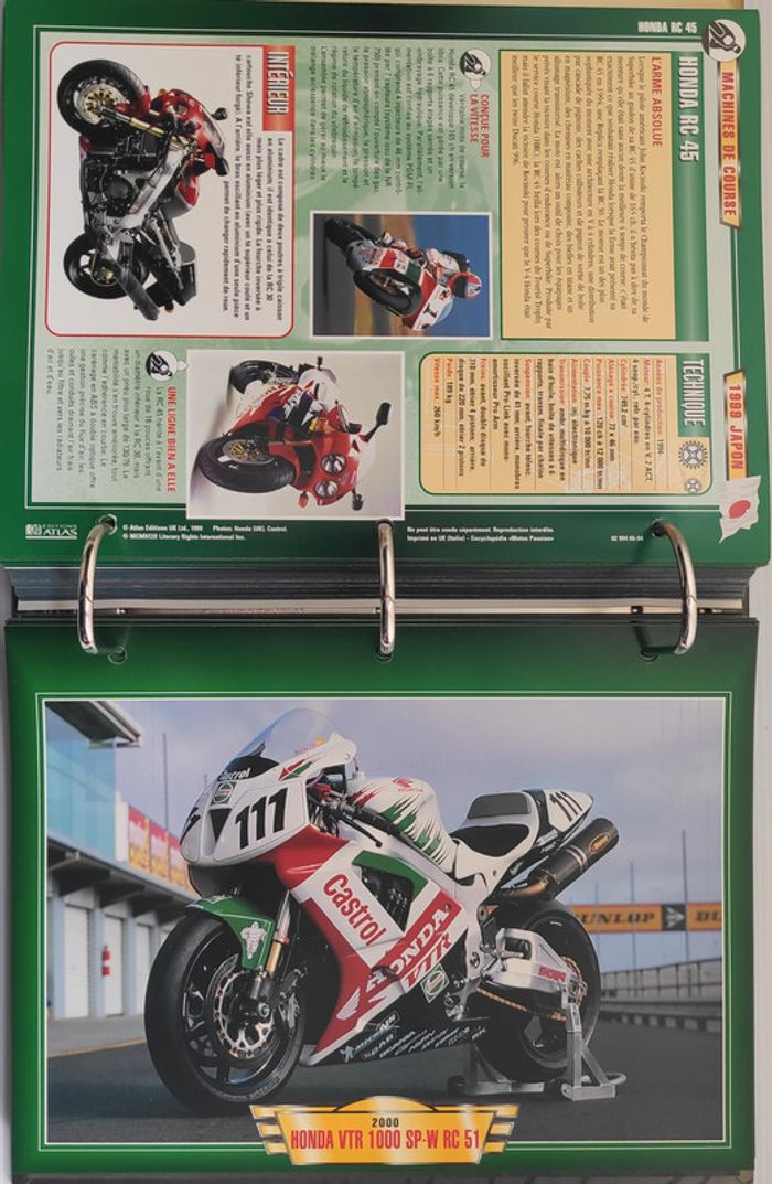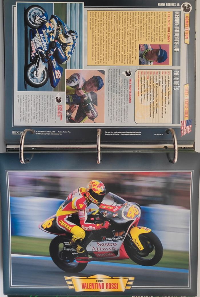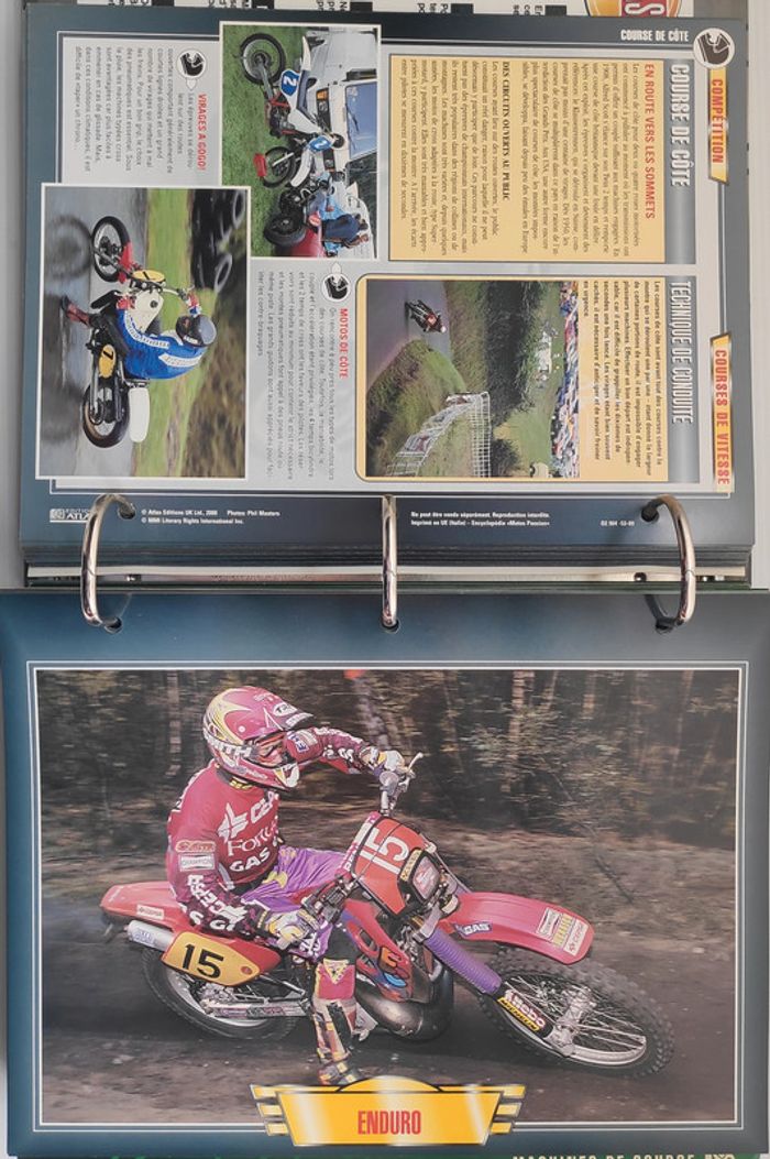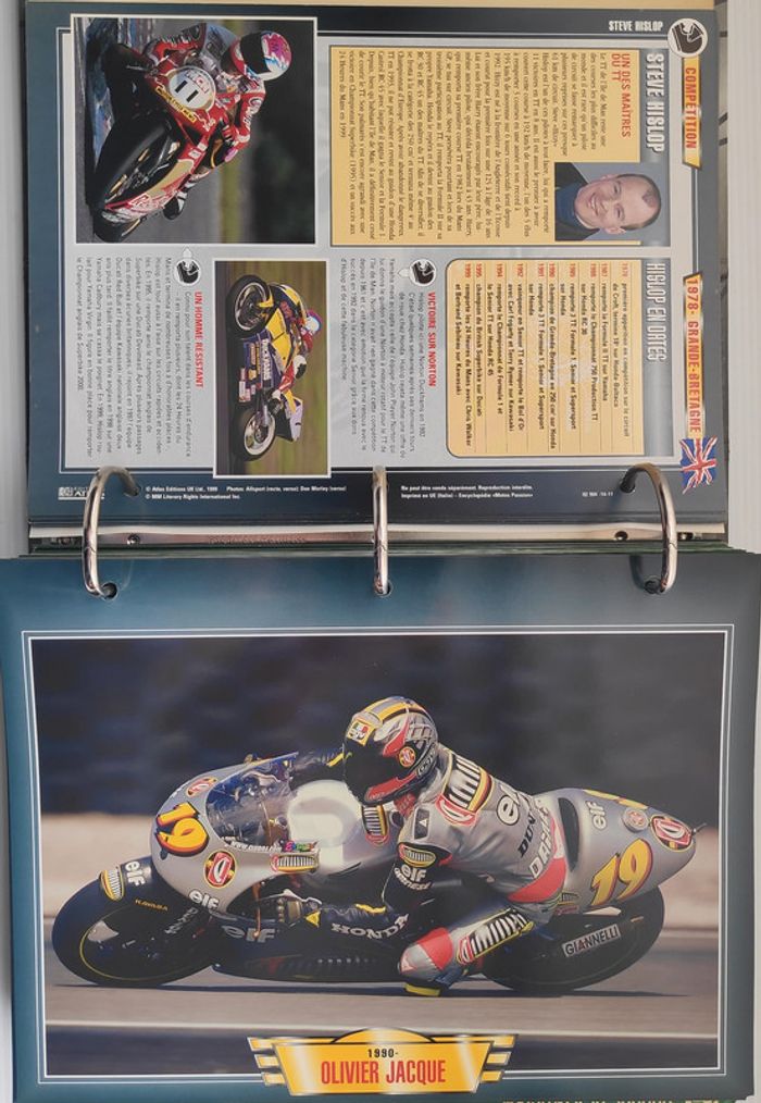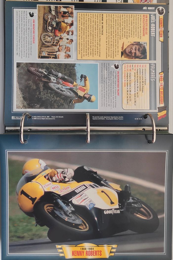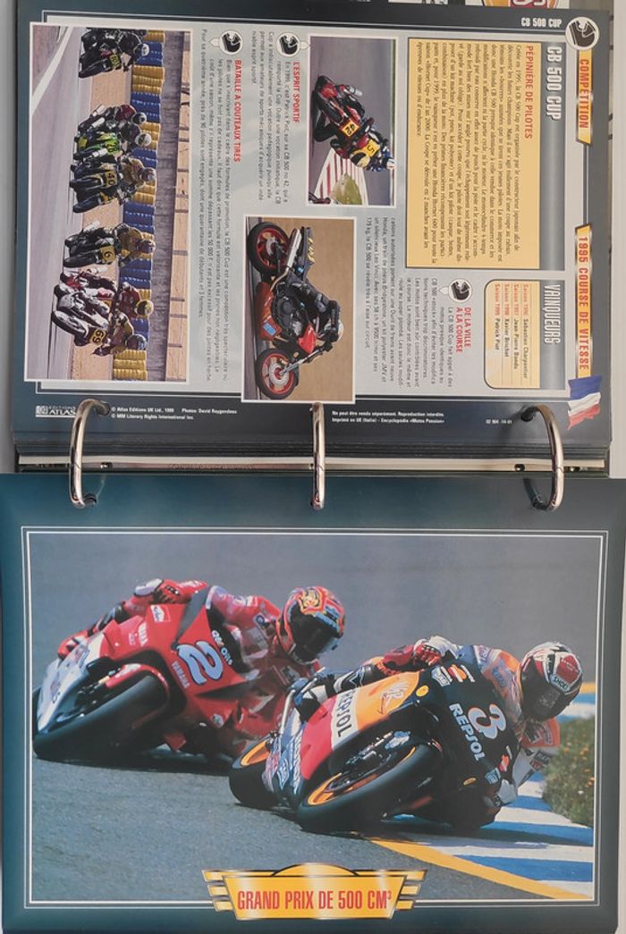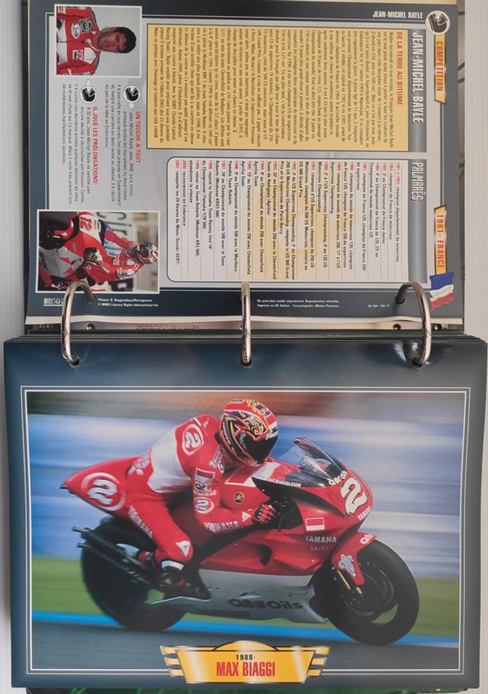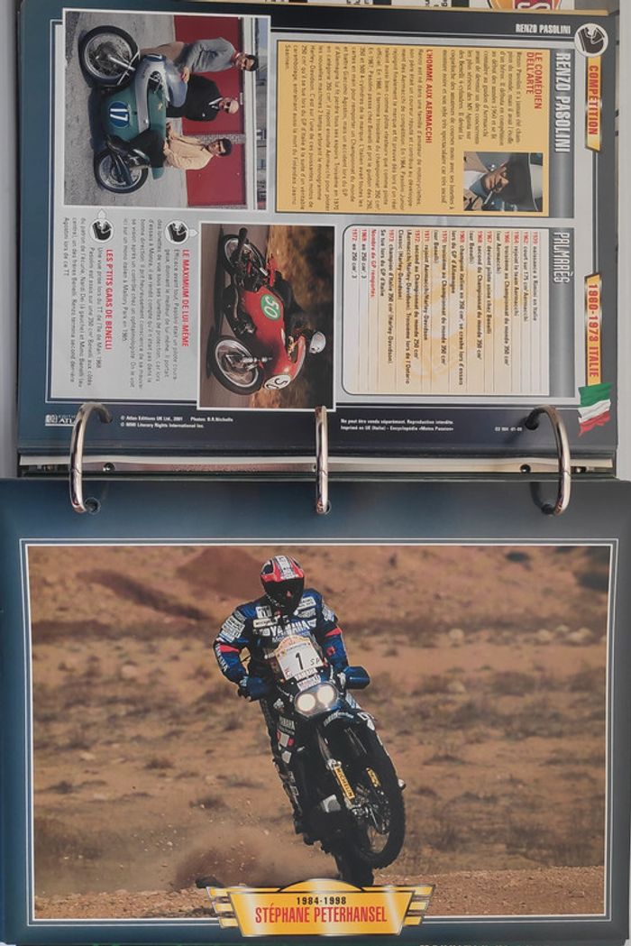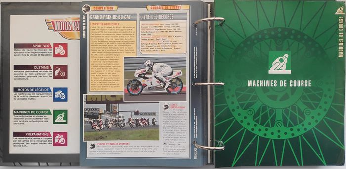 🏍️ Compétition (99 fiches) : Jean-Michel Bayle, Max Biaggi, Steve Hislop, Olivier Jacque, Régis Laconi, Renzo Pasolini, Stéphane Peterhansel, Joël Robert, Kenny Roberts, Valentino Rossi, CB 500 Cup, Grand Prix de 500 cm3, Course de côte, Enduro, Ile de Man TT, Trial, Les 24 Heures de Spa-Francorchamps, L'Enduro du Touquet, Grand Prix de France, L'ISDT, Le Mans, North West 200...