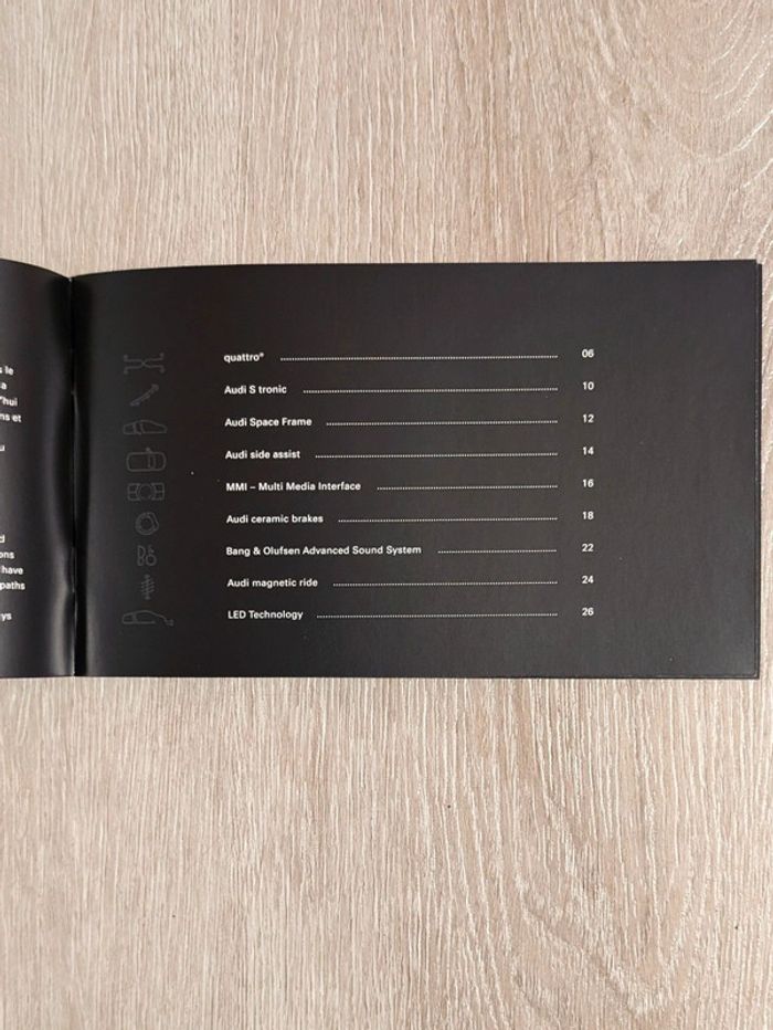 Brochure Audi L'avancée par la technologie Quattro, Audi S tronic, Space Frame, side assist, MMI, freins céramique... Dimensions : 20 x 12 cm 32 pages Texte en français et anglais