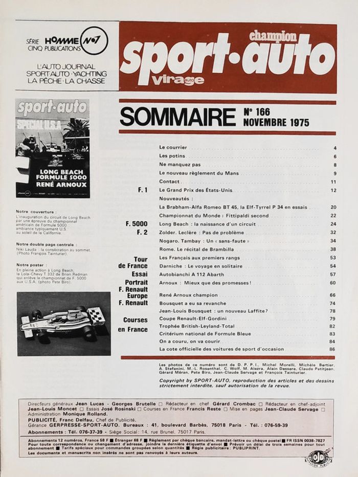 #_SportAuto_ numéro 166 (novembre 1975) Grand Prix F1 des États-Unis,Formule 2, Long Beach Formule 5000, Autobianchi A 112 Abarth, René Arnoux... Il manque 12 pages centrales