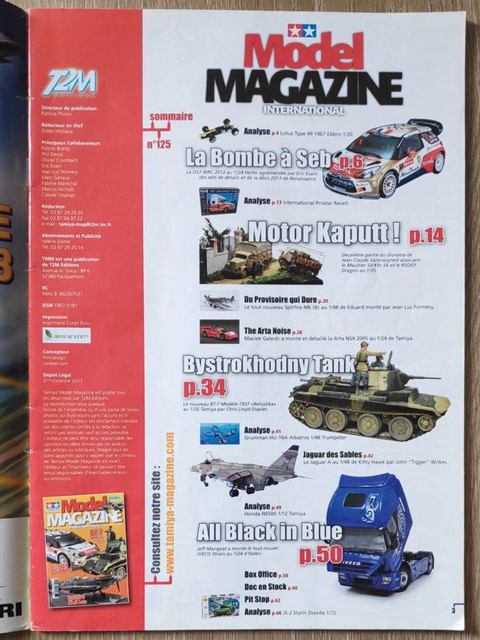 Tamiya Model numéro 125 (septembre 2013) Modélisme DS3 WRC 2012 Heller 1/24 Sébastien Loeb, diorama Maultier / RSO 1/35, Spitfire Mk.IX 1/48, Arta NSX 2005 1/24 Tamiya, BT-7 Modèle 1937 1/35 Tamiya, Jaguar A 1/48 Kitty Hawk, Honda NS500 1/12 Tamiya, Iveco Stralis 1/24 Italeri... 68 pages