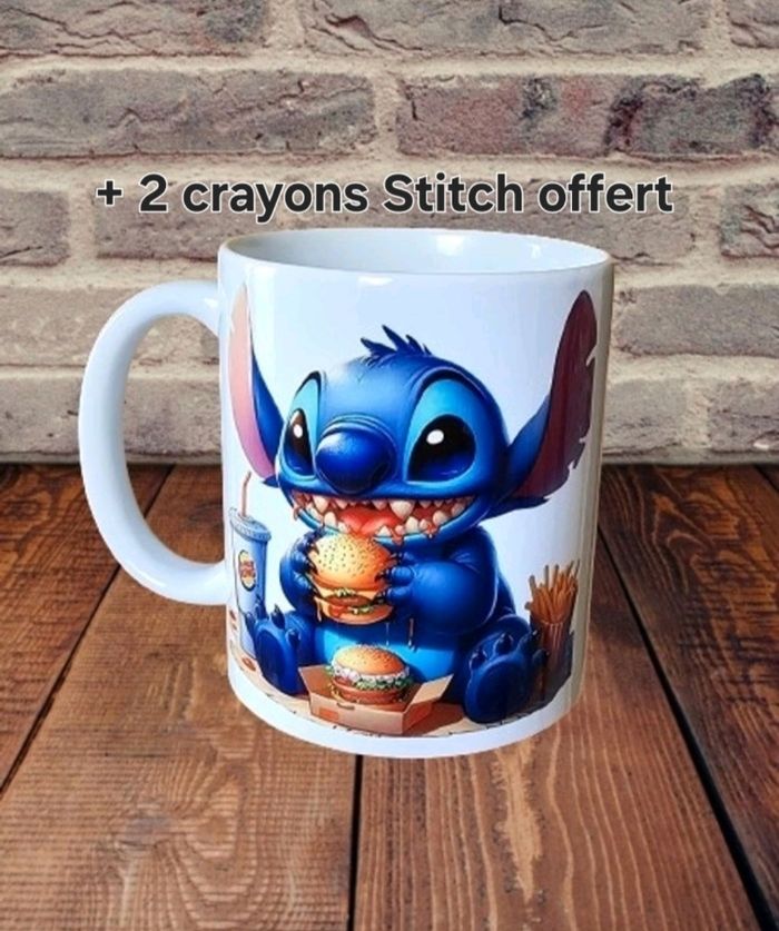 Mug stitch hamburger + 2 crayons stitch offert Passe au lave vaisselle et micro-onde Impression recto verso Prix ferme