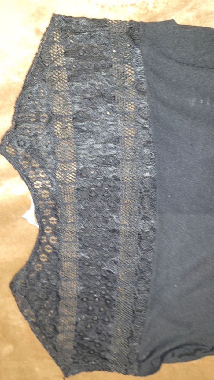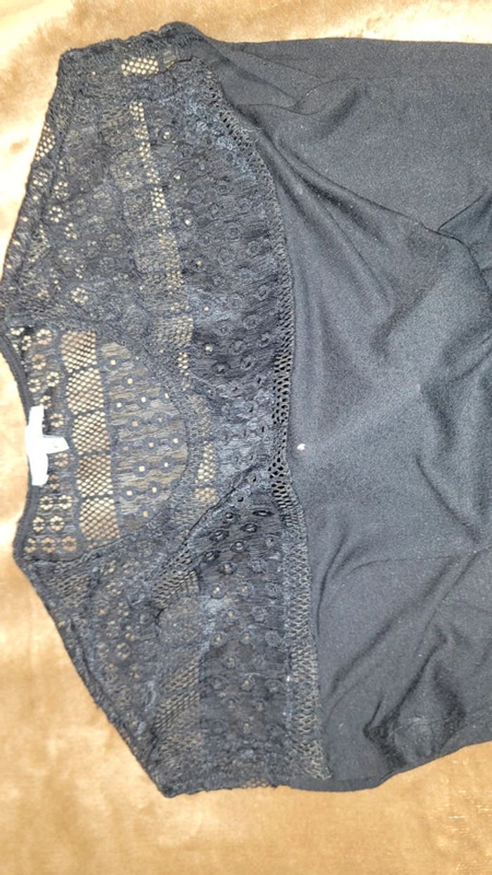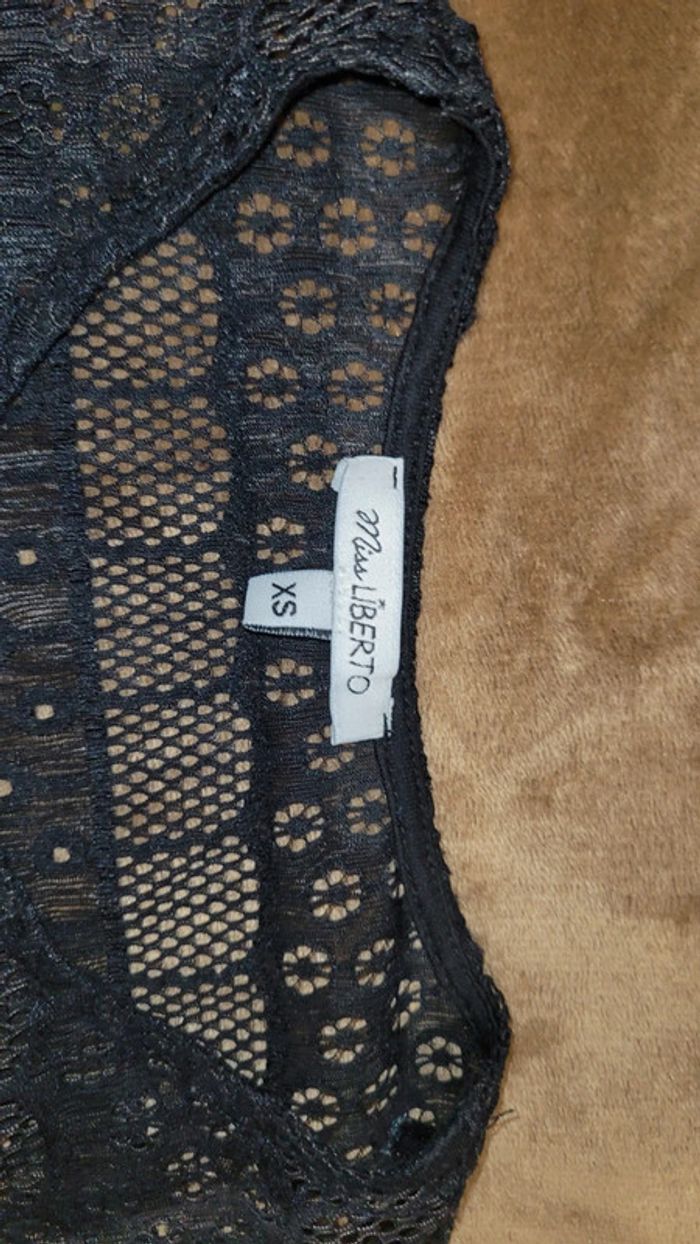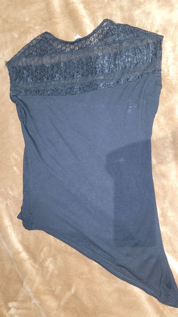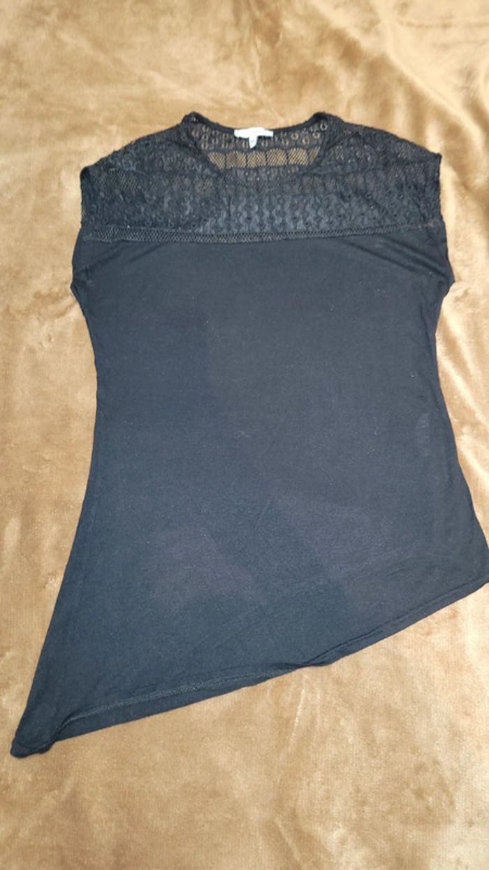 Jolie t-shirt dentelle et donc semi transparent sur le haut du t-shirt et bas asymétrique . Un petit trou sur le devant ne se voit presque pas (voir dernière photo) taille xs mais assez large donc convient largement pour une taille S aussi. Marque miss Liberto. Réduction sur les lots !! Jetez un oeil à mon dressing les soldes continuent !! 🥰🥰