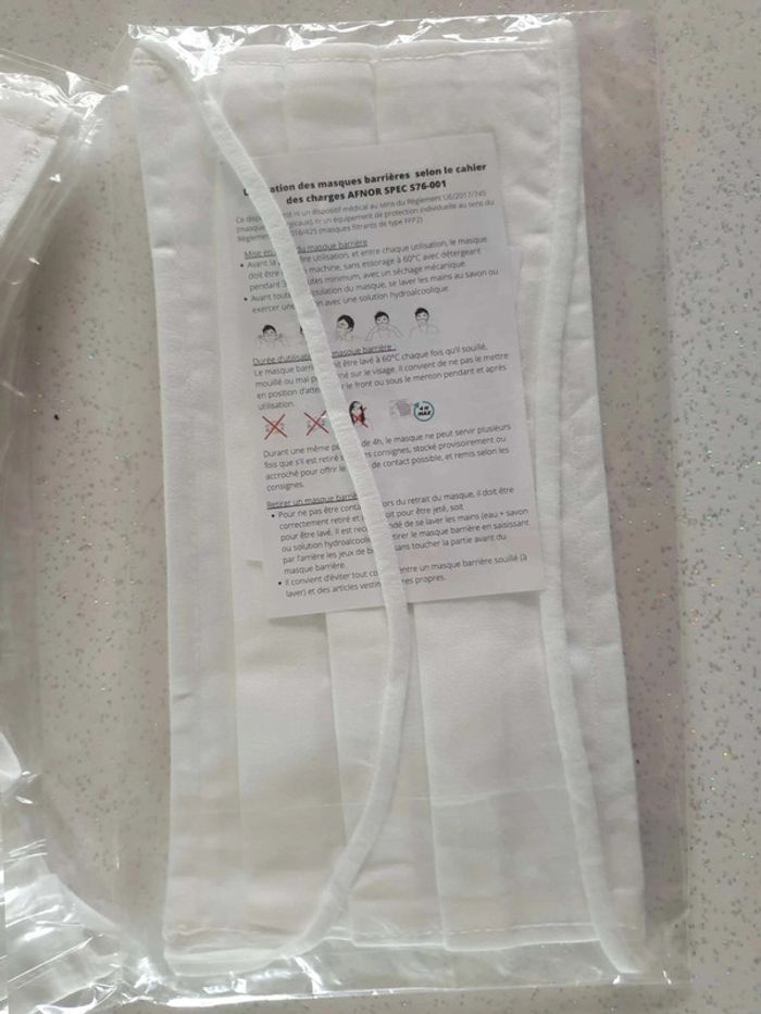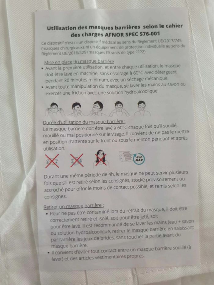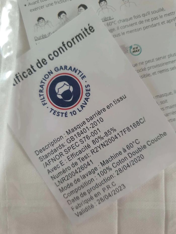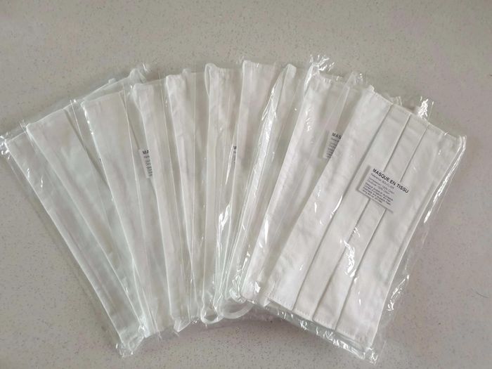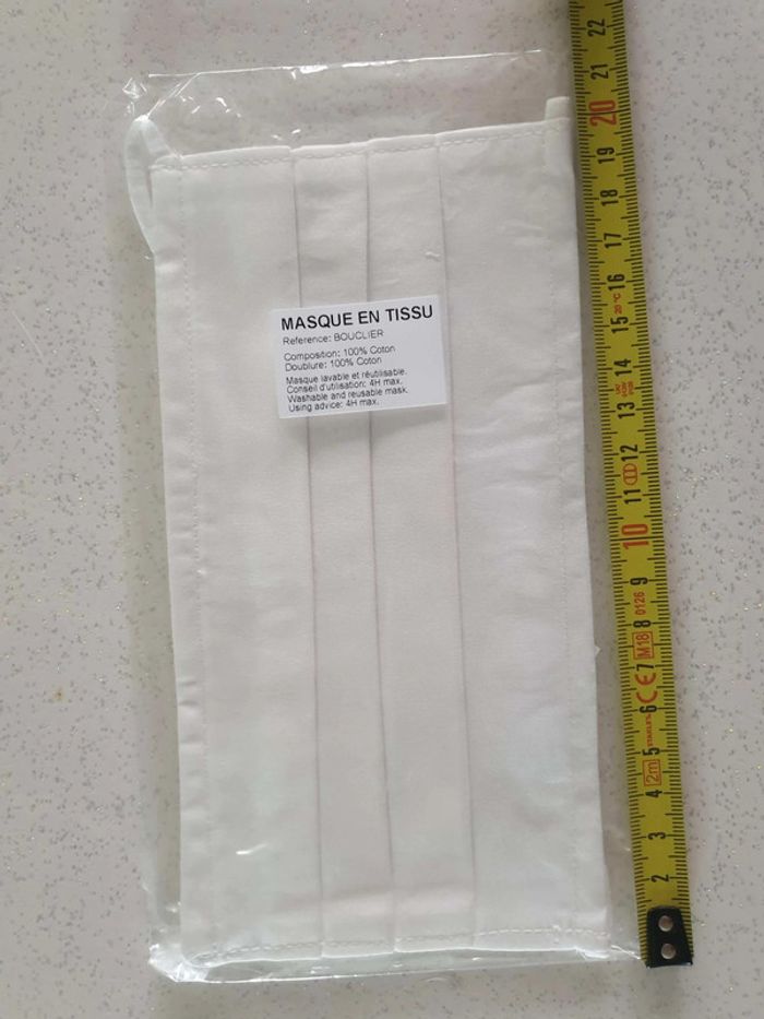 Strictement neufs Répondent à la norme Afnor Lavables 10 fois Couleur blanc Dimensions sur photos Les élastiques passent derrière la tête et non derrière les oreilles