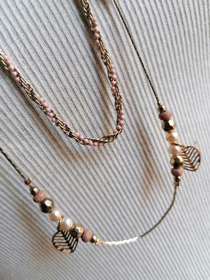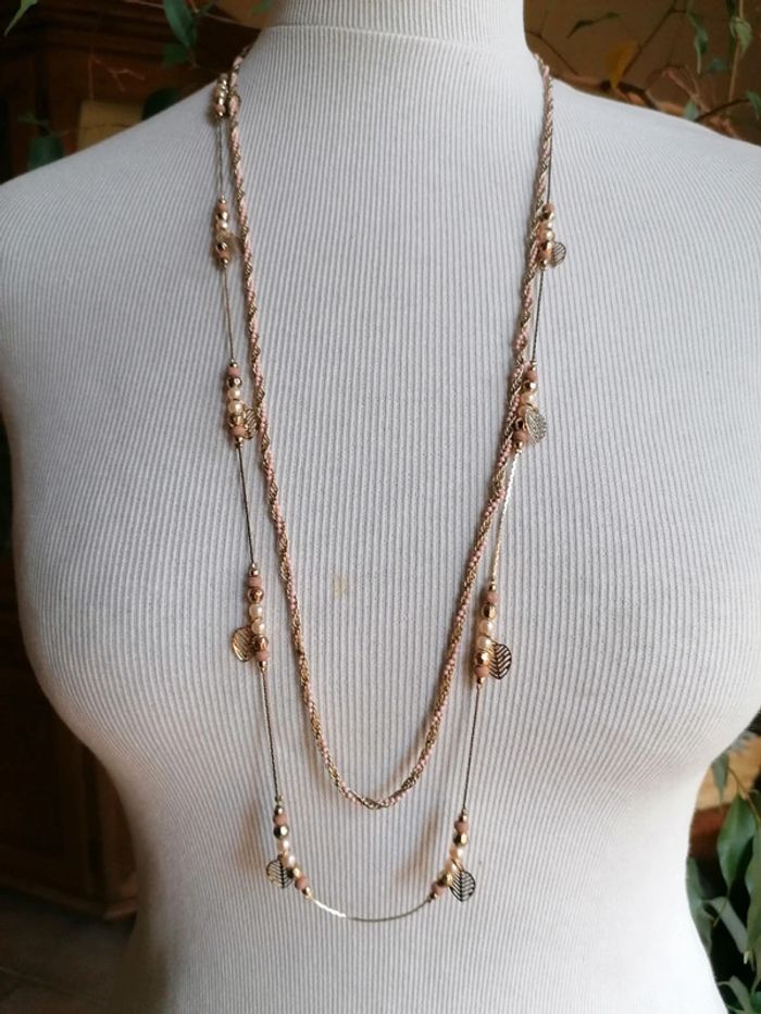Long collier sautoir. Porté 2 ou 3 fois. Perles et metal doré