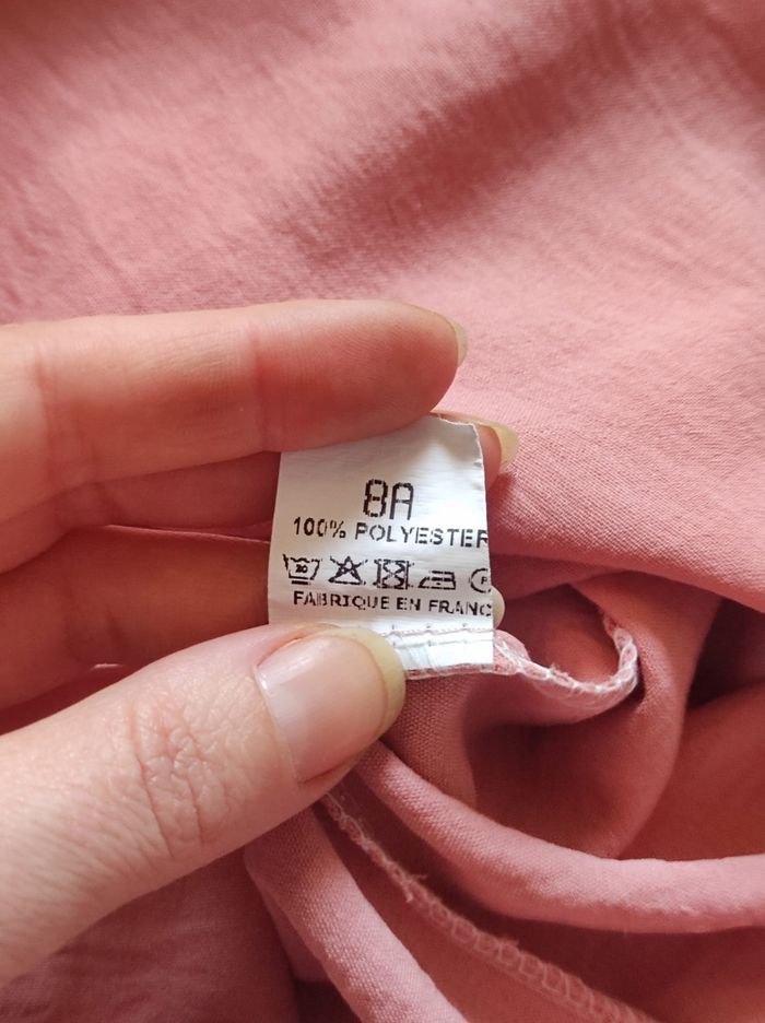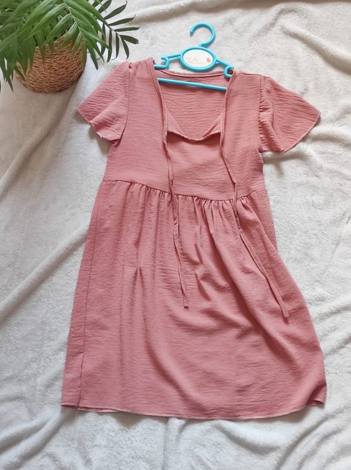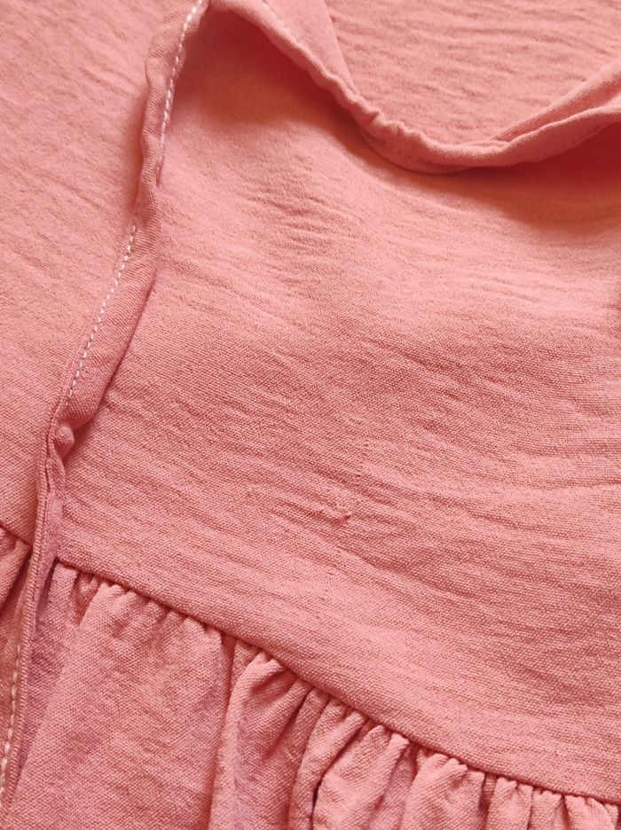 belle robe rose / saumon à manches courte et décolleté à noué. Fluide et légère, parfait pour les beaux jours ensoleillés. De taille 8ans, 100% polyester. Un petit accros