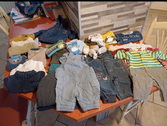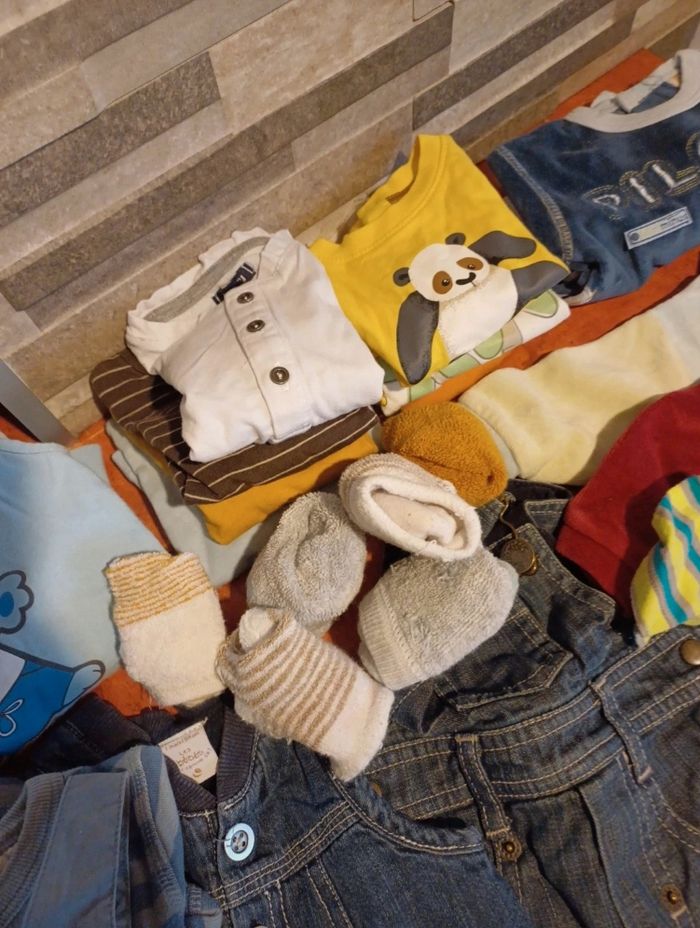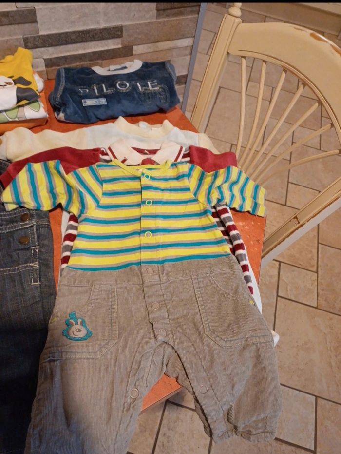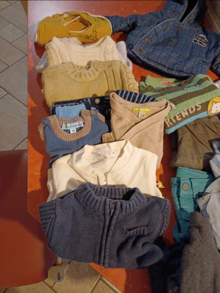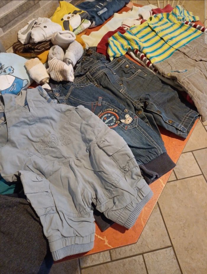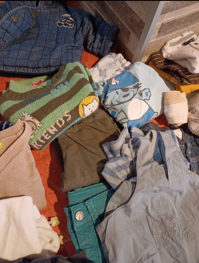 Lot comprenant 1 pyjama deux pièces en velours avec pieds 2 pyjamas en velours avec pieds 1 combinaison manches longues 2 salopettes en jean 1 ensemble salopette / T.shirt manches longues 1 ensemble salopette / body manches longues 1 ensemble pantalon / polo / pull 7 T.shirts manches longues 1 veste à capuche 4 pulls 1 pull léger sans manches 2 gilets 1 sweat zippé 2 pantalons légers et confortables 1 jean 2 bavoirs Quelques chaussettes De toutes marques : bonobi, vertbaudet, kimbaloo, kitchoun, orchestra, grain de blé...... Possibilité d avoir d autres photos