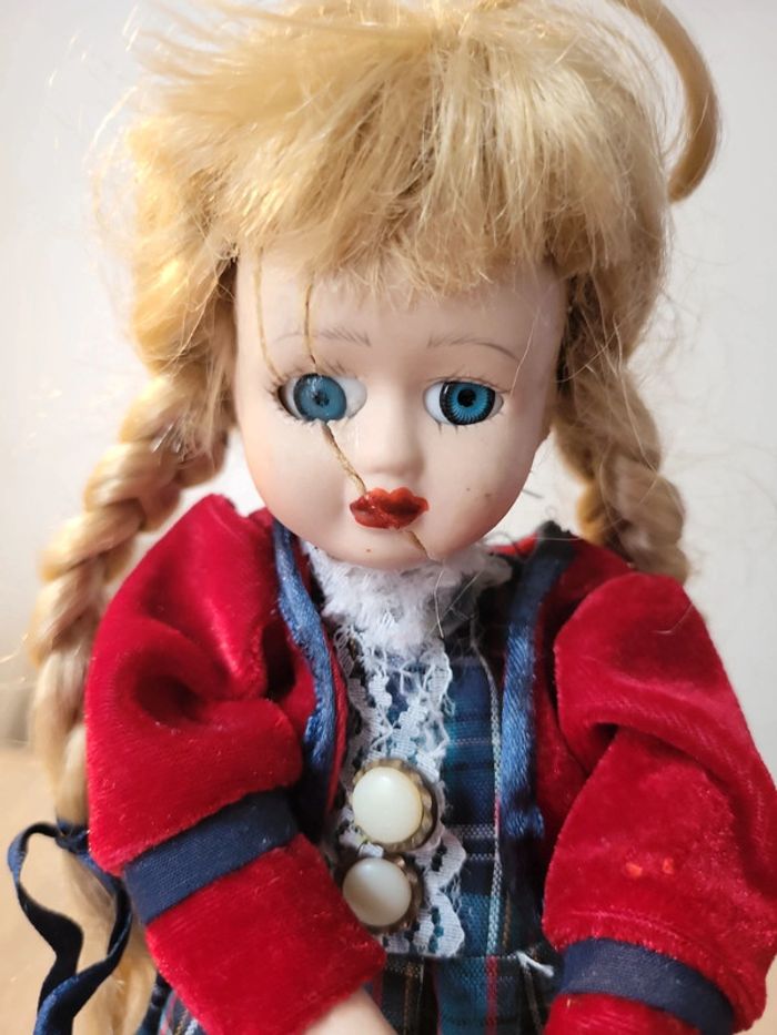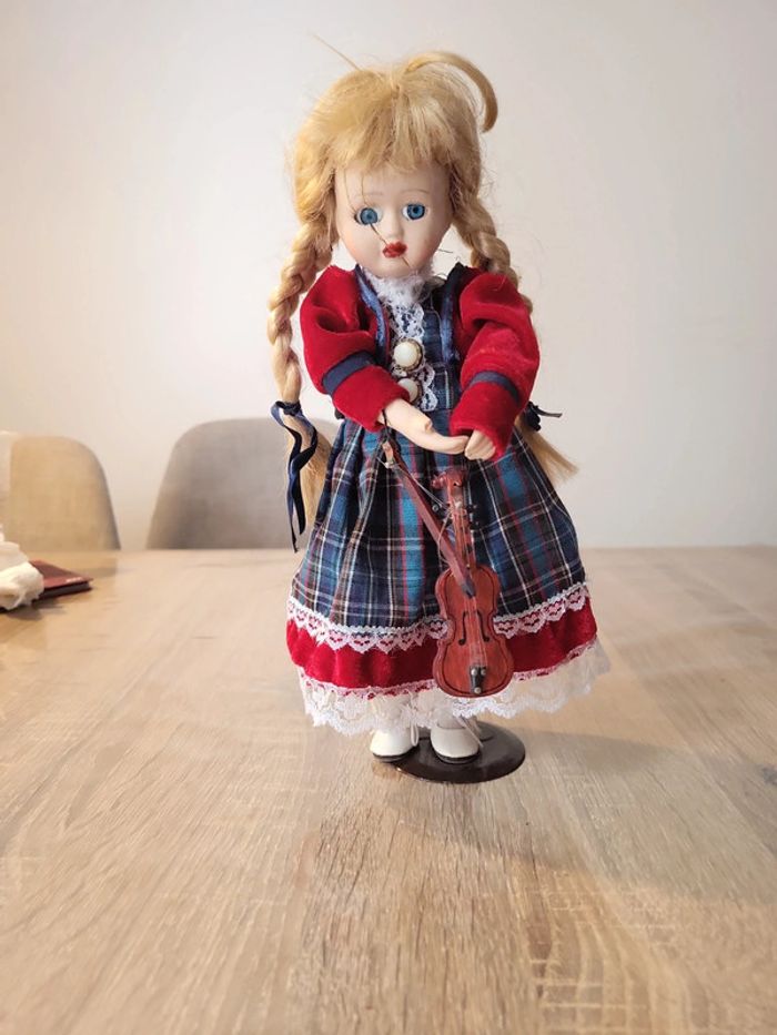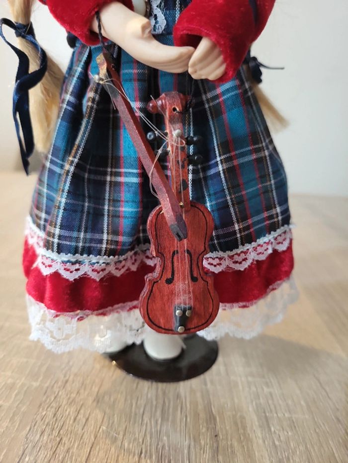 Poupée ayant subit beaucoup de dégâts La tête à été recollé, sa main est cassé cordes du violons abîmé. Idéal restaurateur Environ 29cm