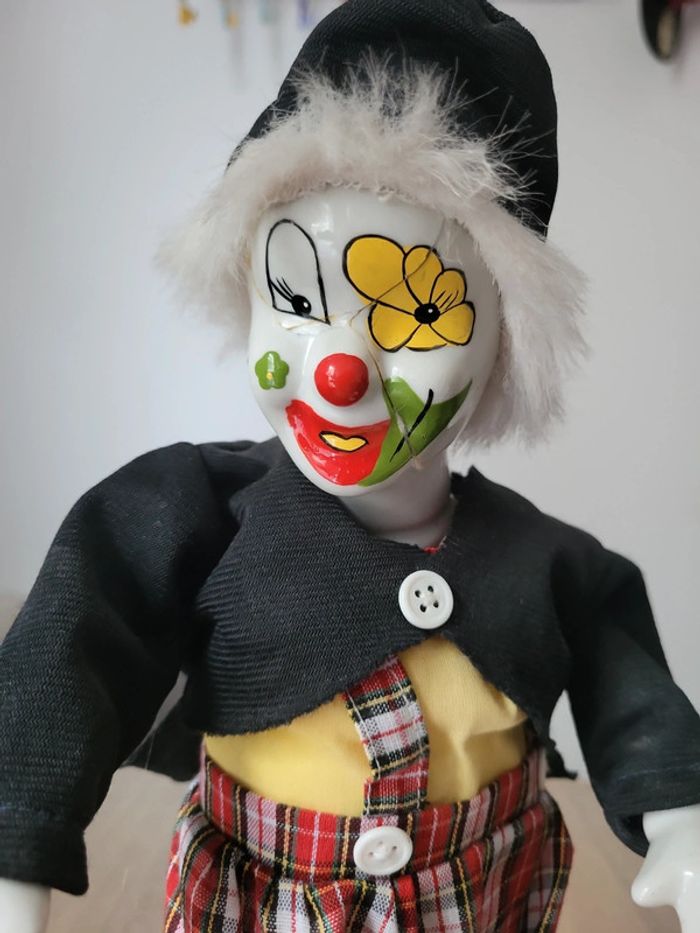 Joli clown en porcelaine automate. Il fonctionne parfaitement. Il a subit de la casse au visage et au pied 31 cm environ