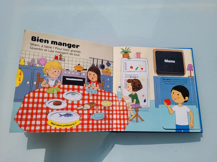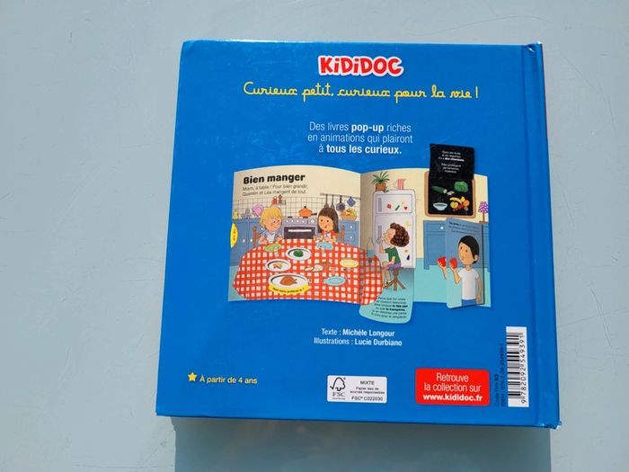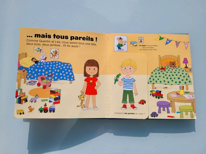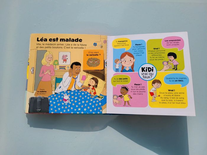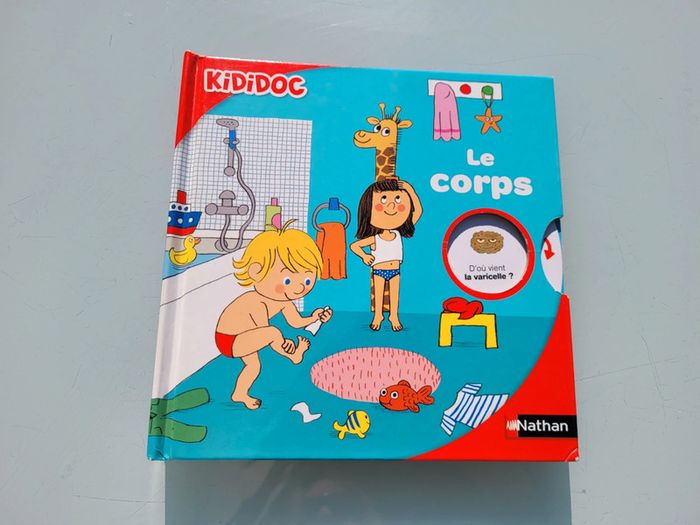 KIDIDOC LE CORPS Des flaps à soulever, une tirette à actionner, des rabats à déplier...pour comprendre toutes les choses étonnantes qui se passent à l'intérieur de notre corps : Pourquoi transpire-t-on ? Qu'y a-t-il sous la peau ? Combien notre squelette compte-t-il d'os ? Les os sont-ils fragiles ? Comment respire-t-on ? Que deviennent les aliments que nous mangeons ? À quoi sert le cerveau ? À part un flap abîmé (cf dernière photo ( en très bon état Mes autres Kididocs : #kididocmooglou Mes livres par thème : #livrelecorpshumainmooglou Mes autres livres enfants : #livreenfantmooglou