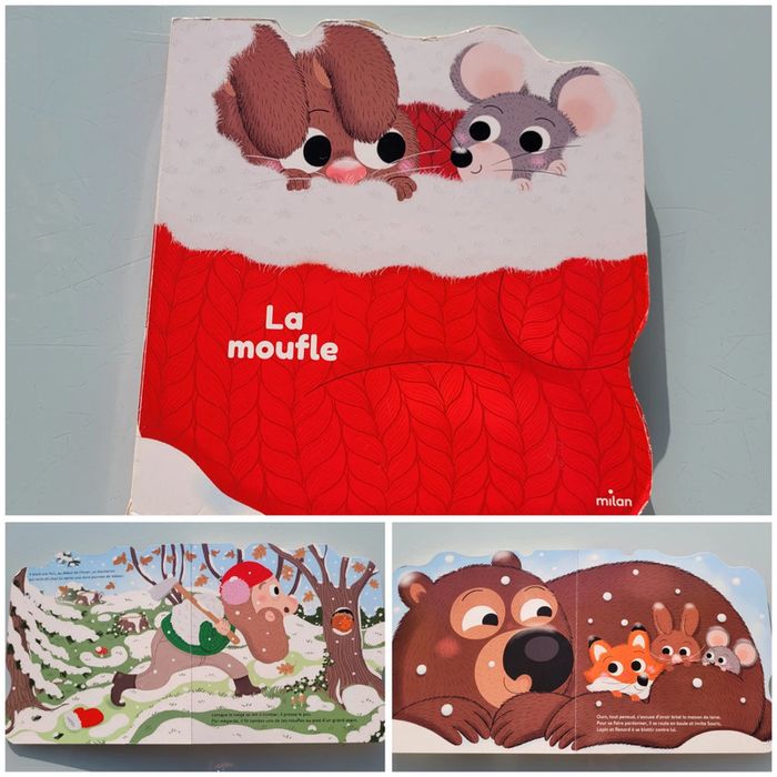 LA MOUFLE ÉDITIONS MILAN EN FORME DE MOUFLE Un bûcheron laisse tomber sa moufle sur le sol enneigé. Souris, Lapin, Renard et Ours, glacés par le vent, veulent se réfugier dans la moufle pour passer la nuit au chaud. Cet abri sera-t-il assez grand pour tout le monde ? Format : 25x26 cm Bords et coins un peu élimés mais en très bon état intérieur Mes autres livres enfants : #livreenfantmooglou