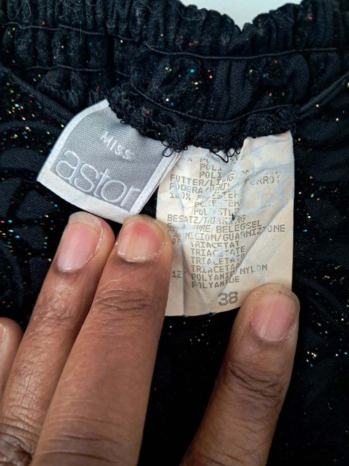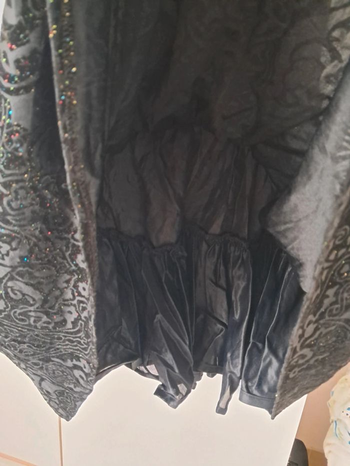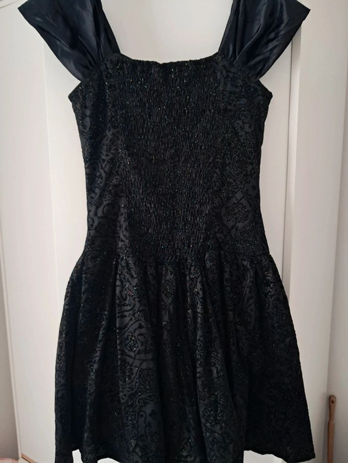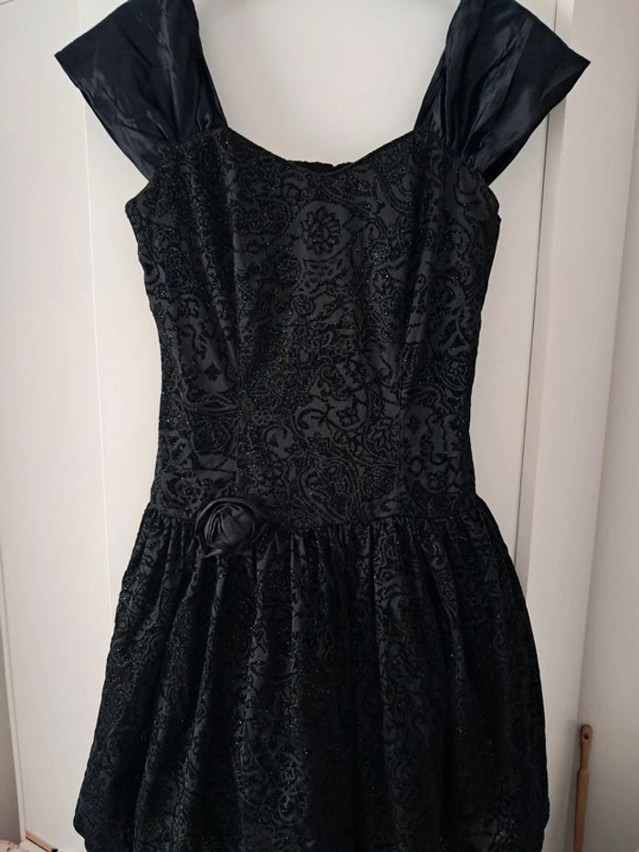 Petite robe noire, avec des manches courtes. Il y a une fleur accrochée devant. La robe est pailletée. Taille 38, très bon état. Marque miss astor.