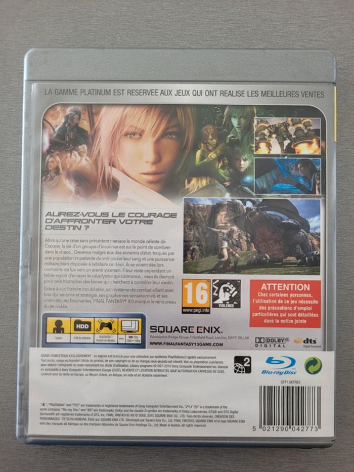 Jeux vidéo pour console PlayStation 3 . PS3 . Final fantasy XIII . Avec notice . Jeux testé . N'hésitez pas à me contacter pour toute question ou pour me dire vos recherches . d'autre jeux disponible ps1 ps2 ps3 ps4 psp ... ect Remise en mains propre sur Gardanne est ces alentours ou Marseille devant l'hôpital Nord . Regarder mes autres annonces pour vos achats groupé .