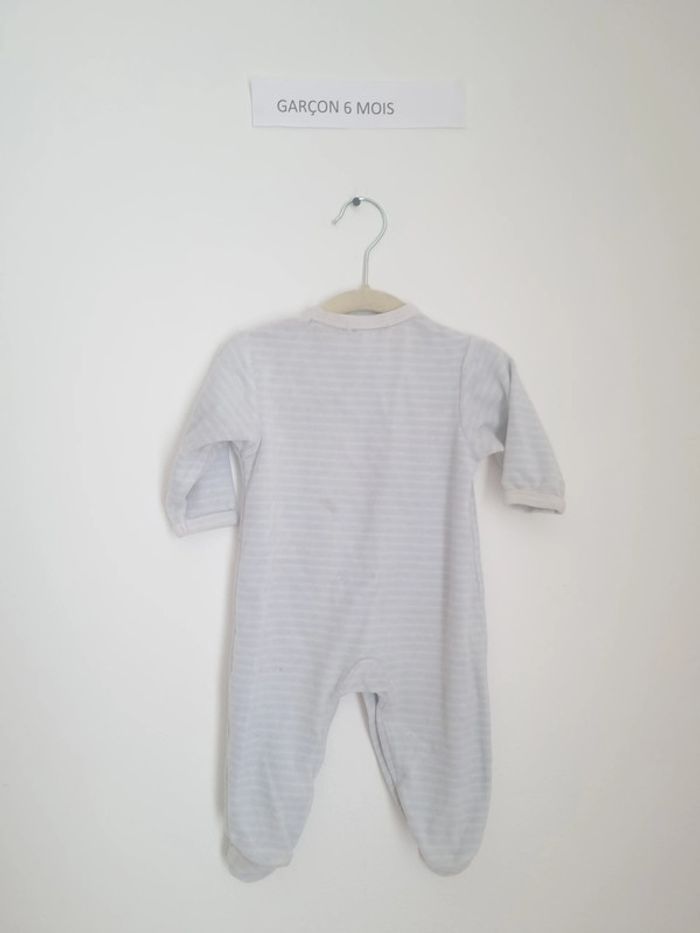 Pyjama 1 pièce chaud utilisé plusieurs fois mais en très bon état marque Tex taille 6 Mois fermeture par boutons pression sur l'avant gris clair rayé blanc présence de tâche sur la photo, mais je relave tous les vêtements avant envoi, normalement tout part mais au cas où je le prends en compte dans le prix