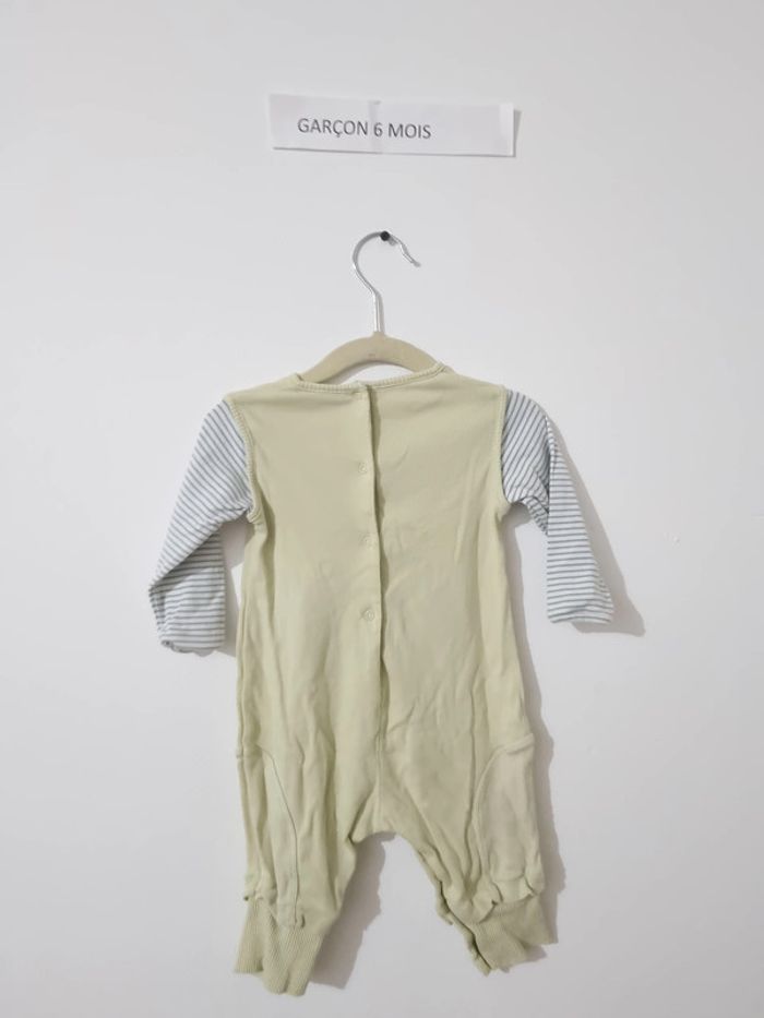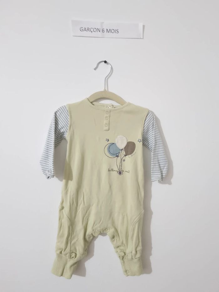 Pyjama 1 pièce épais utilisé plusieurs fois mais en très bon état marque Aubisou taille 6 Mois fermeture par boutons pression sur l'arrière et au niveau de l'entre jambe vert amande , manche rayées gris et blanc, motif ballon de baudruche sur le devant pas de pieds mixte plutôt garçon