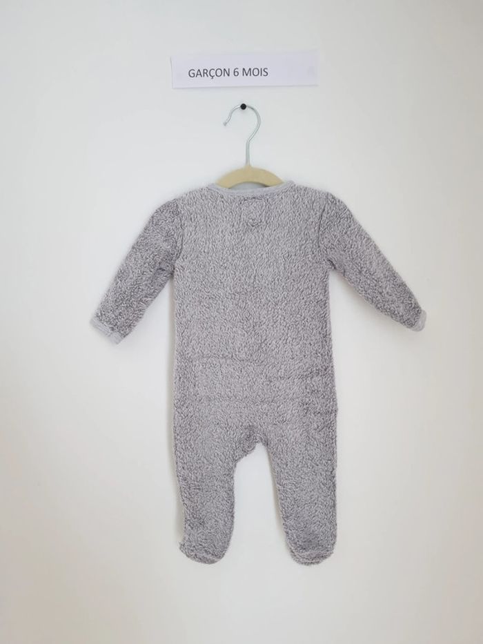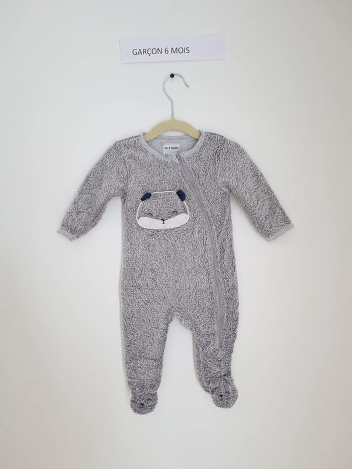 Pyjama 1 pièce chaud utilisé plusieurs fois mais en très bon état marque Pat et Ripaton taille 6 Mois fermeture par zip sur l'avant, du col au pied aspect peluche avec un petit animal sur le devant mixte