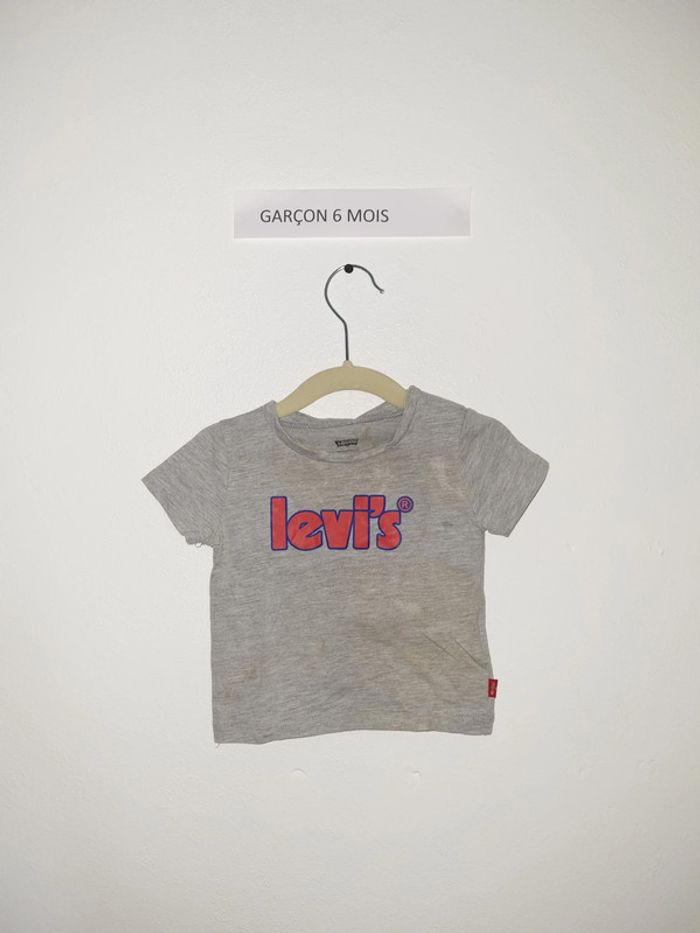 T-shirt manches courtes gris avec inscription Levi's ouverture au col par boutons pression sur le côté Marque Levi's 6 mois Peu porté en bon état Une tâche est visible sur la photo, mais je relave tous les vêtements avant l'envoi, je prends en compte cela dans le prix au cas où ça ne parte pas