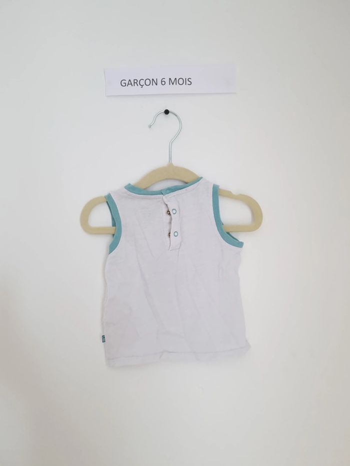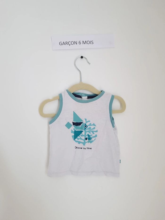 Débardeur blanc avec biais bleu clair avec illustration poisson et algues ouverture à l'arrière par boutons pression jusqu'à mi- dos Marque Obaïbi 6 mois Porté plusieurs fois mais en très bon état