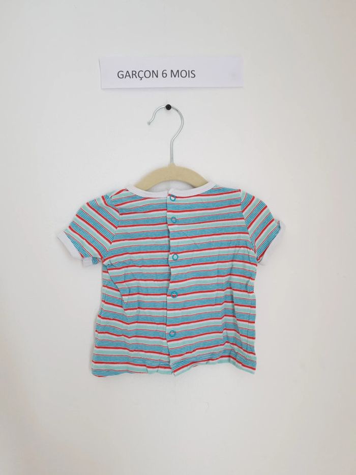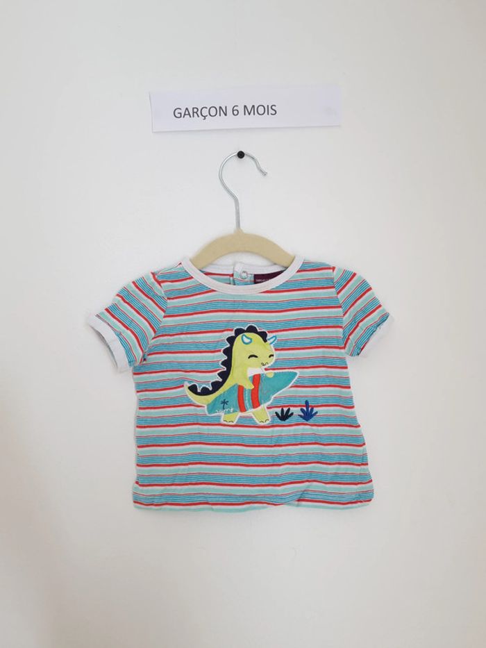 T-shirt manches courtes rayé bleu et rouge avec illustration dinosaure vert et sa planche de surf ouverture à l'arrière par boutons pression Marque sergent major 6 mois Peu porté en très bon état