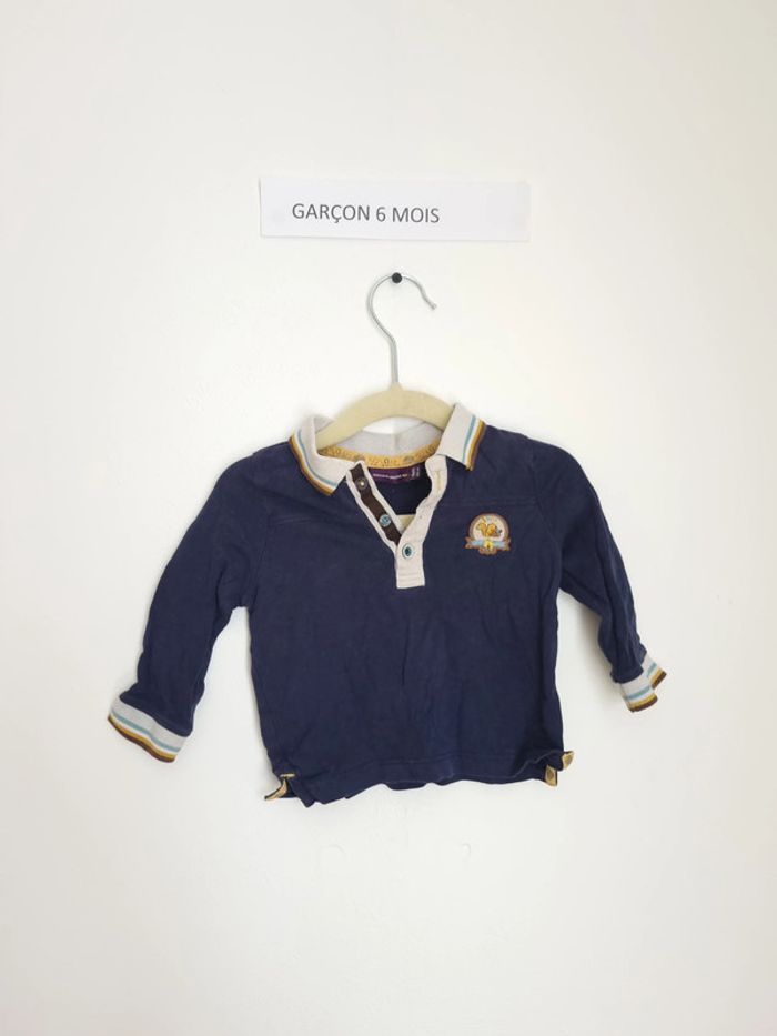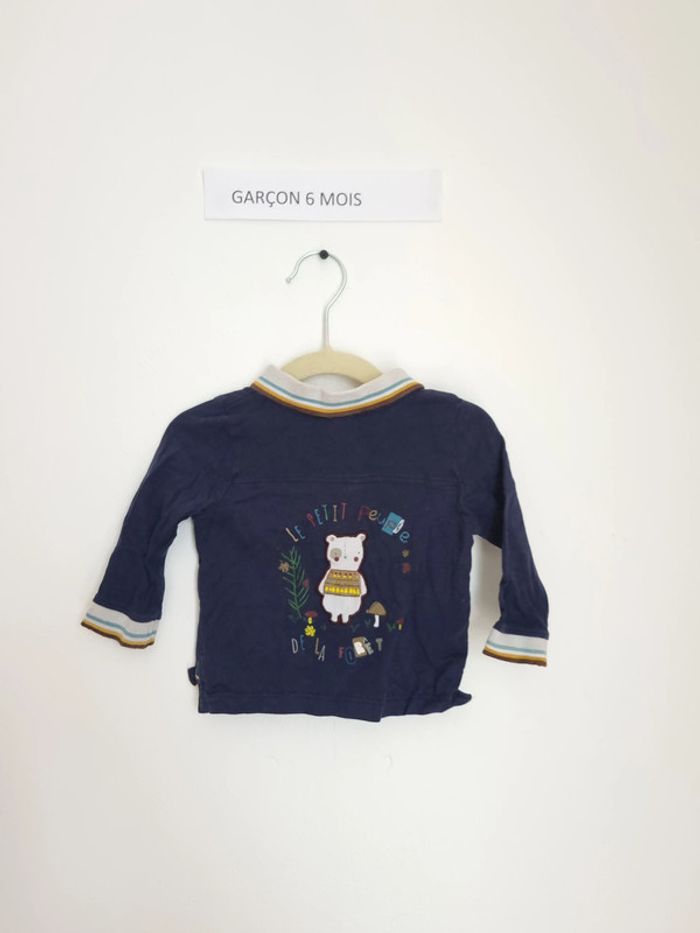 T-shirt manches longues bleu marine style polo avec inscription sur le dos "petit peuple de la fôret" avec un petit animal ouverture à l'avant par bouton jusqu'à mi poitrine Col cut way Marque Sergent major 6 mois Peu porté en très bon état