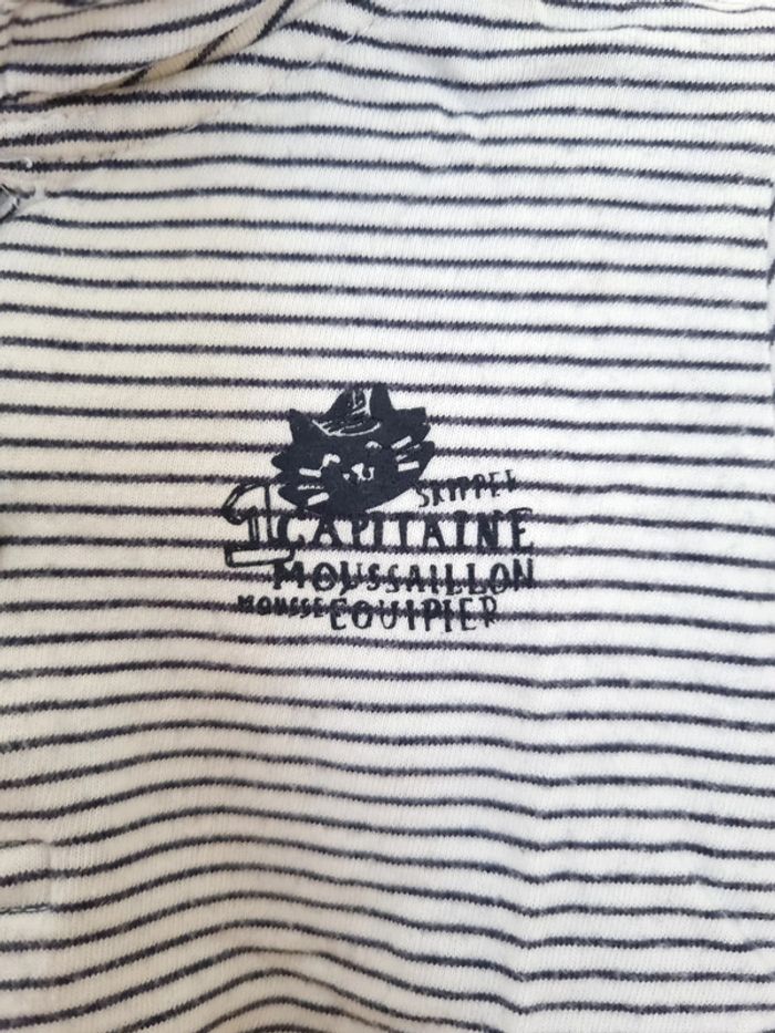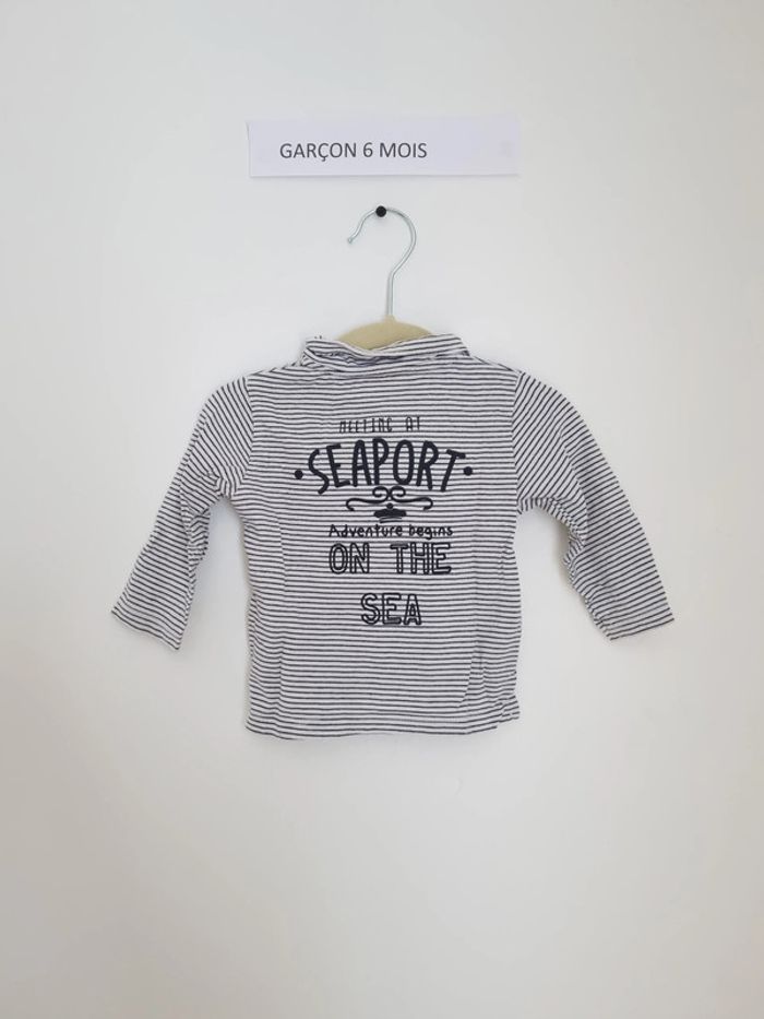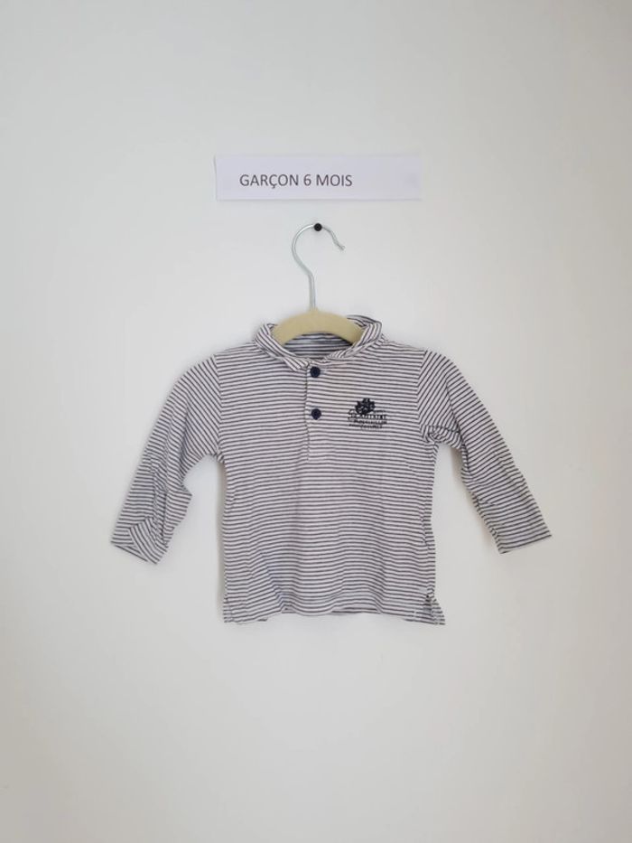 T-shirt manches longues rayé bleu nuit et blanc style polo avec inscription en thème marin ouverture sur le devant par boutons col cut way Marque vertbaudet 6 mois Peu porté en très bon état