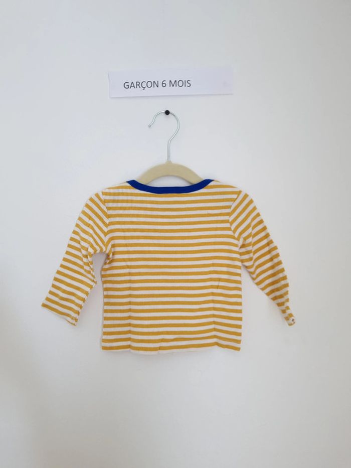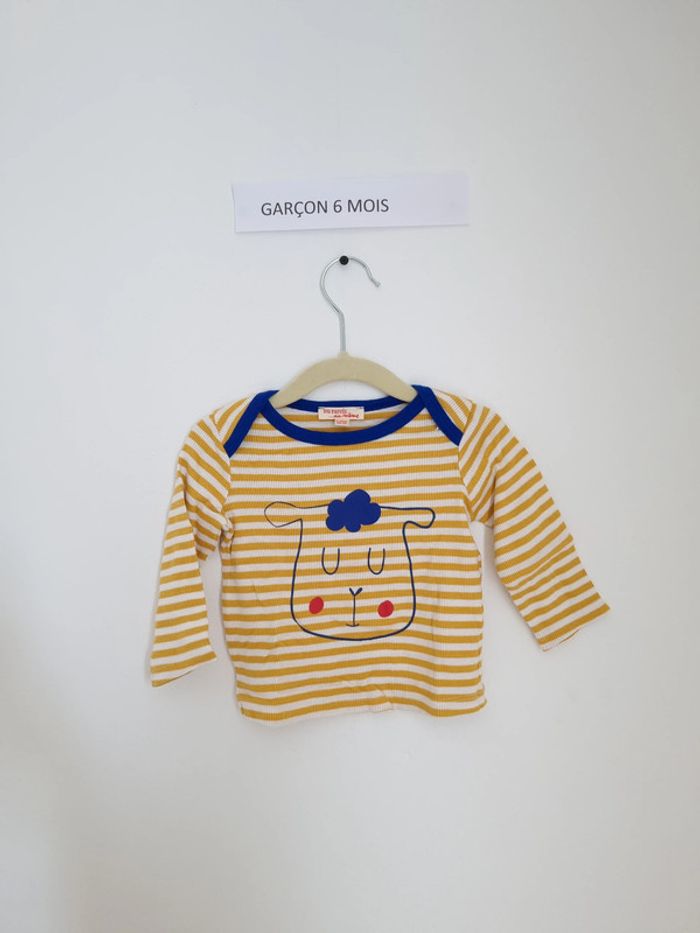 T-shirt manches longues rayé blanc et jaune avec dessin de mouton bleu marine ouverture au col par encolure américaine bleue marine Marque Du pareil au même 6 mois Peu porté en très bon état