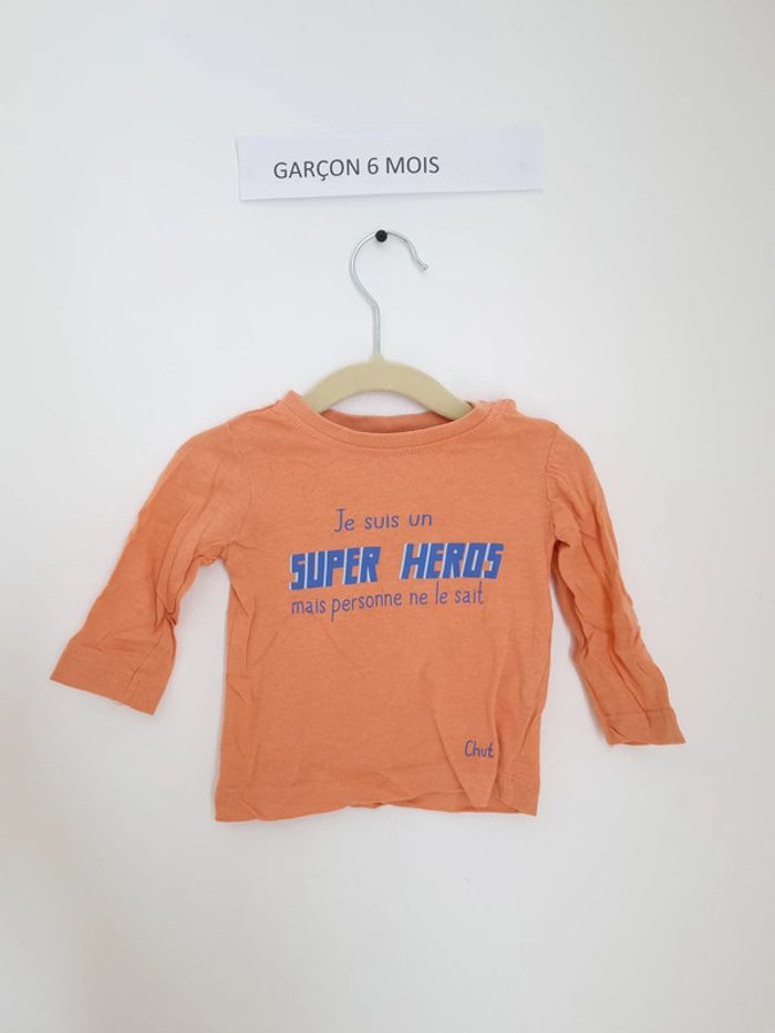 T-shirt manches longues orange avec inscription "je suis un super héro mais personne ne le sais.. chut" en bleu ouverture au col par boutons pression sur le côté Marque Mot d'enfant 6 mois Peu porté en très bon état