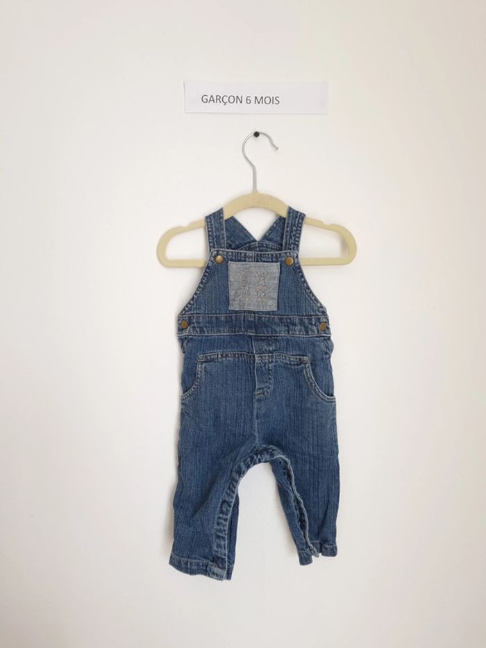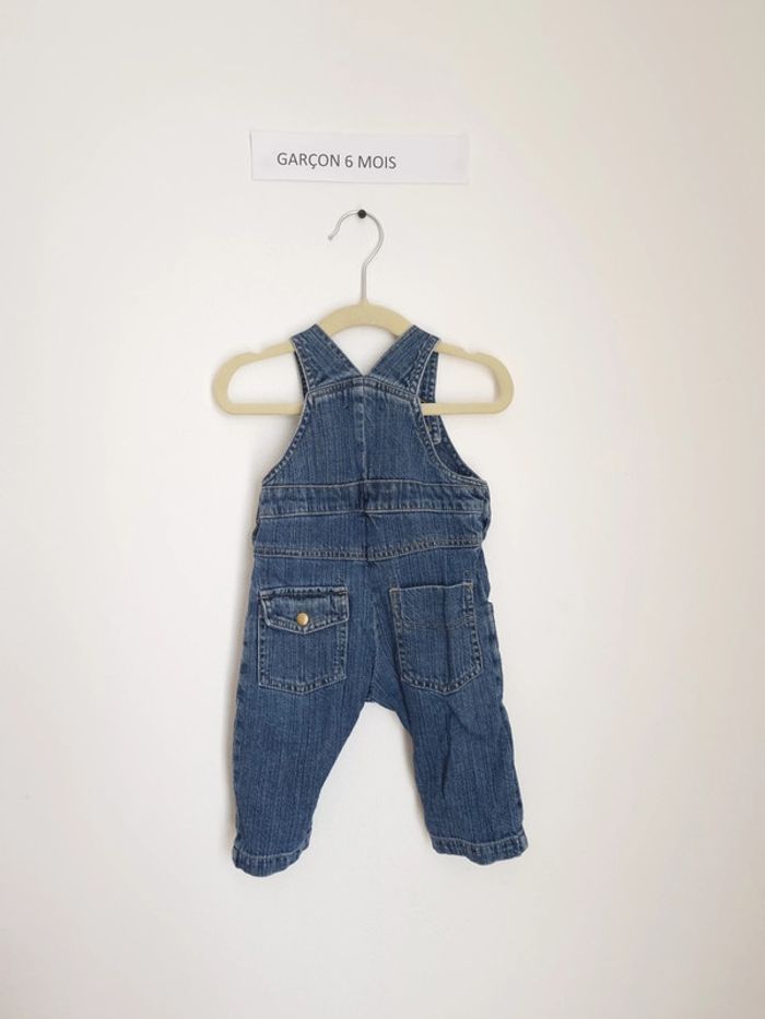 Salopette en jean Attache en boutons pression sur le devant Ouverture également au niveau de l'entre-jambe en boutons pressions peu portés en très bon état Marque tout compte fait Taille 6 mois 67 cm