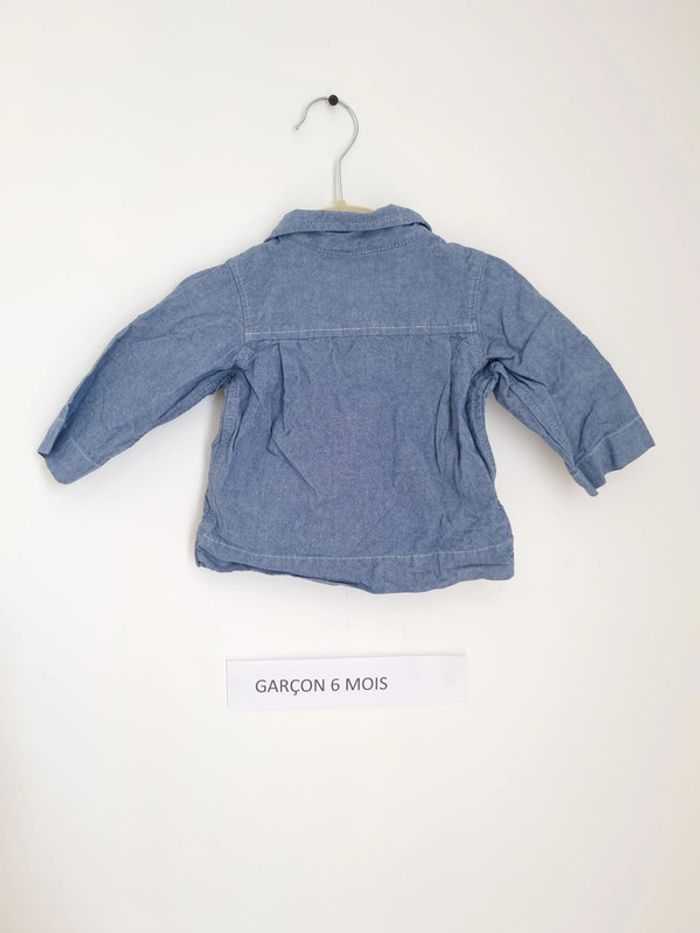 Chemise manche longue épaisse Peu porté en très bon état uni effet jean bleu ouverture sur le devant par boutons (cachés) jusqu'à mi poitrine col cut away, 2 poches sur le devant Marque jacadi 6 mois