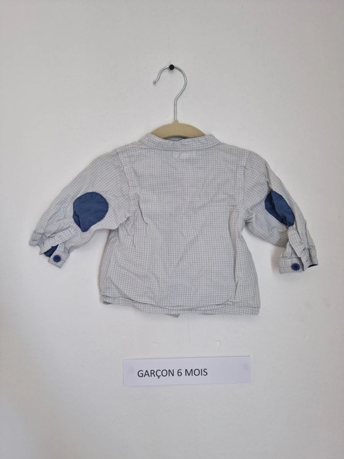 Chemise manche longue avec un col officier Peu porté en très bon état à petit carreau gris clair et blanc doublure sur les coudes bleu marine et boutons bleu marine Marque Kimbaloo taille 6 mois
