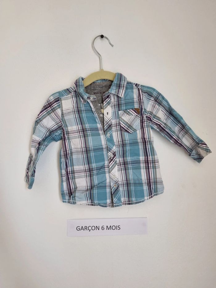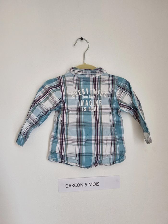 Chemise manche longue Peu porté en très bon état à carreau bleu blanc et marron broderie sur le dos "everything you can imagine is real" qui signifie "tout ce que tu peux imaginer est réel" col cut away Marque grain de blé taille 6 mois