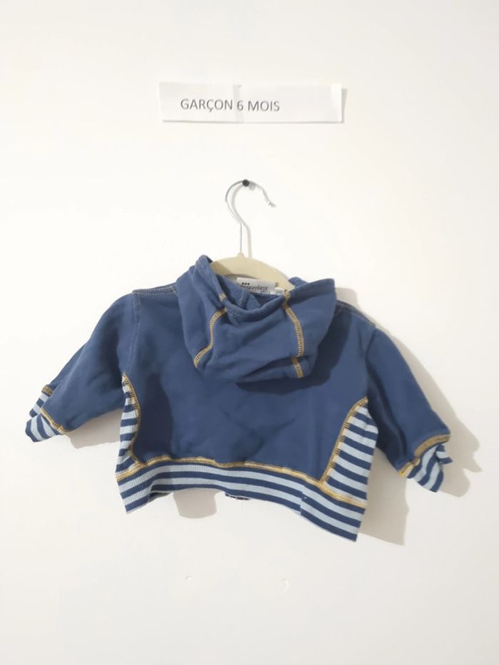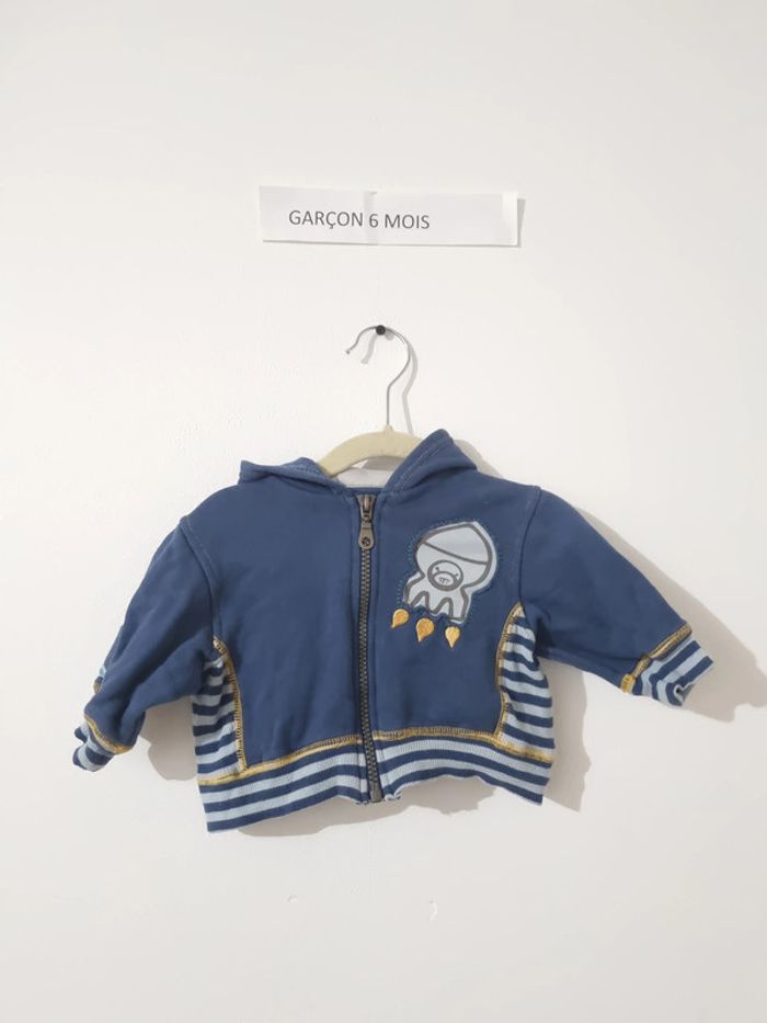 Gilet Zippé sur le devant avec capuche bleu pastel Motif fusée gris rayure bleu et gris sur le bas et les manches et cotes du gilet en jaune moutarde très bon état porté quelque fois taille 6 mois marque tout simplement