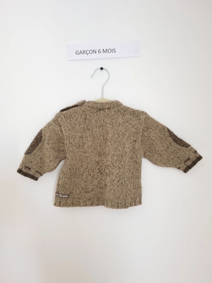 Pull bien chaud tauper avec motif nuage et chien marron avec inscription " un temps de chien Mr Lucien" boutons sur le coté dans l'encolure Très bon état porté quelque fois taille 6 mois marque sergent Du pareil au même