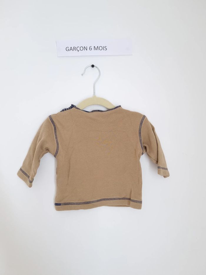 Pull fin beige foncé inscription "soleil en haubans dans le couchant marin prépare son caban " avec un dessin de caban en bleu marine boutons sur le coté dans l'encolure cotes du pull en bleu marine très bon état porté quelque fois taille 6 mois marque sergent major
