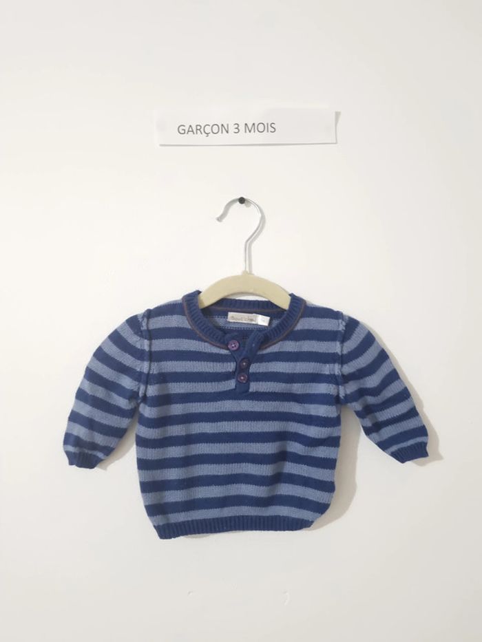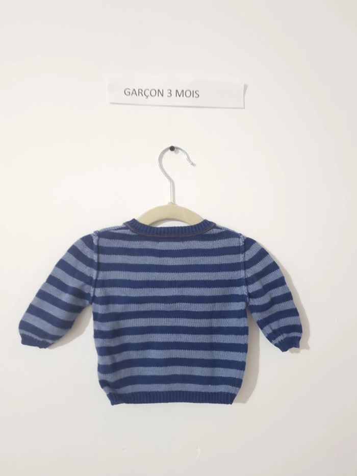 Pull en maille manches longues Fermeture à l'avant par bouton au col Bleu clair rayé de bleu plus foncé marque bout'chou 3 mois Porté quelques fois mais en très bon état