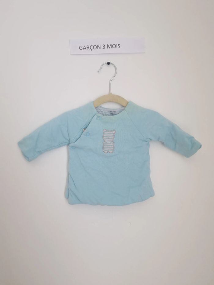 Gilet mixte manches longues Fermeture croisée à l'avant par boutons pressions bleu ciel avec logo Obaïbi Marque Obaïbi 3 mois 59cm Porté quelques fois mais en très bon état