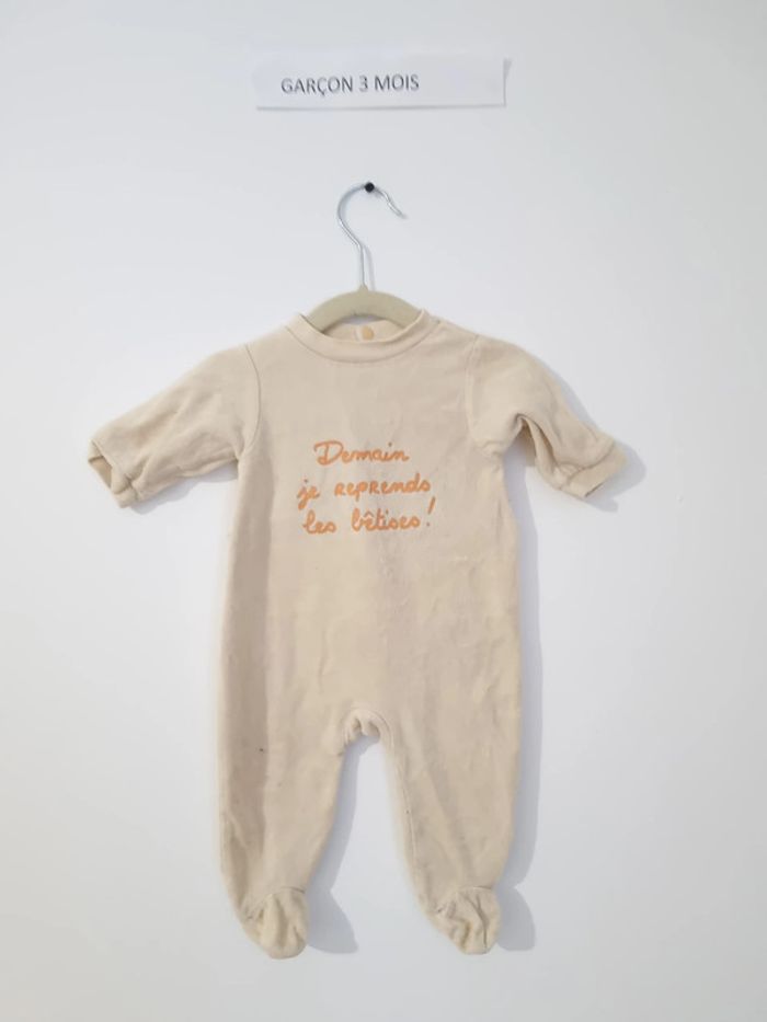 Pyjama 1 pièce chaud utilisé plusieurs fois mais en très bon état 3 mois 60 cm fermeture par boutons pression sur l'arrière couleur jaune clair avec inscription orange " Demain, je reprends les bêtises!" mixte