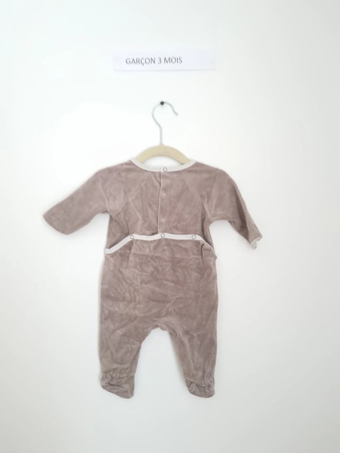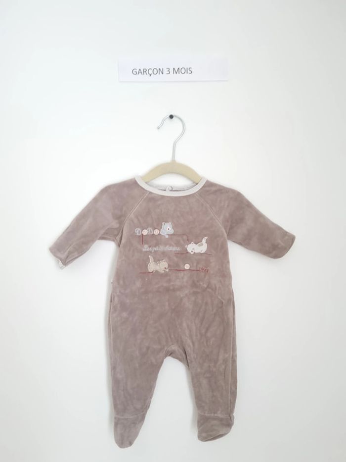 Pyjama 1 pièce chaud utilisé plusieurs fois mais en très bon état marque sergent major 3 mois fermeture par boutons pression sur l'arrière marron taupe à biais blanc et motif chatons qui jouent mixte