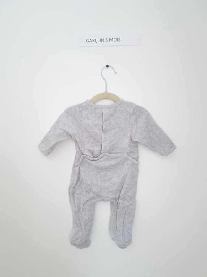 Pyjama 1 pièce chaus utilisé plusieurs fois mais en très bon état marque Mot d'enfants taille 3 Mois fermeture par boutons pression sur l'arrière gris à motif ours avec inscription "hello petit ours" mixte