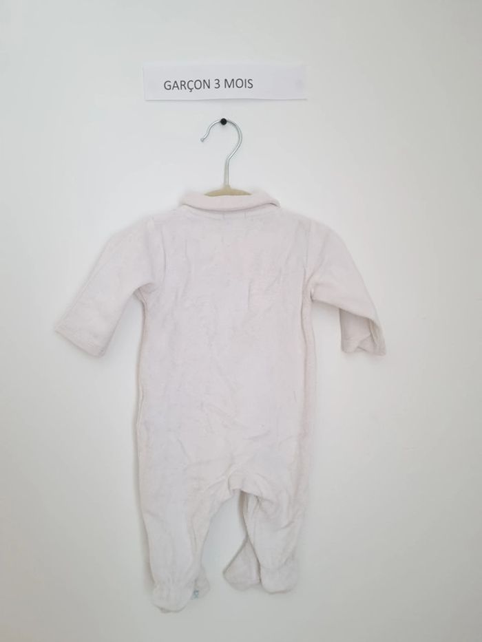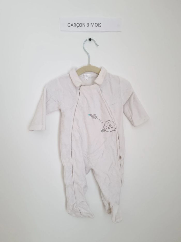 Pyjama 1 pièce chaud utilisé plusieurs fois mais en très bon état marque brioche 3 mois fermeture par 2 rangées de boutons pression sur l'avant allant jusqu'aux pieds blanc avec petit personnage mixte