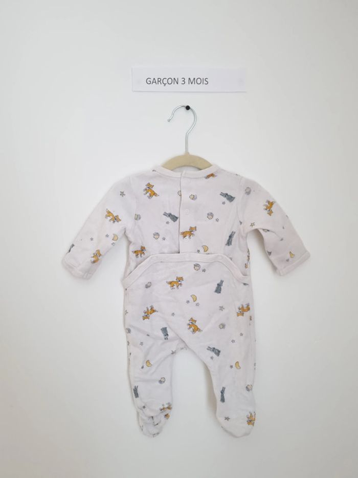 Pyjama 1 pièce chaud utilisé plusieurs fois mais en très bon état marque Kiabi taille 3 Mois 56-62cm fermeture par boutons pression sur l'arrière blanc avec motifs aléatoire lapins , renards, et hérissons mixte