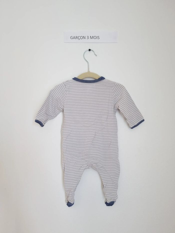 Pyjama 1 pièce léger utilisé plusieurs fois mais en très bon état marque obaïbi 3 mois 59 cm fermeture par boutons pression sur l'avant blanc à rayures grises, biais bleu marine avec poches et petit dessin d'un lion mixte