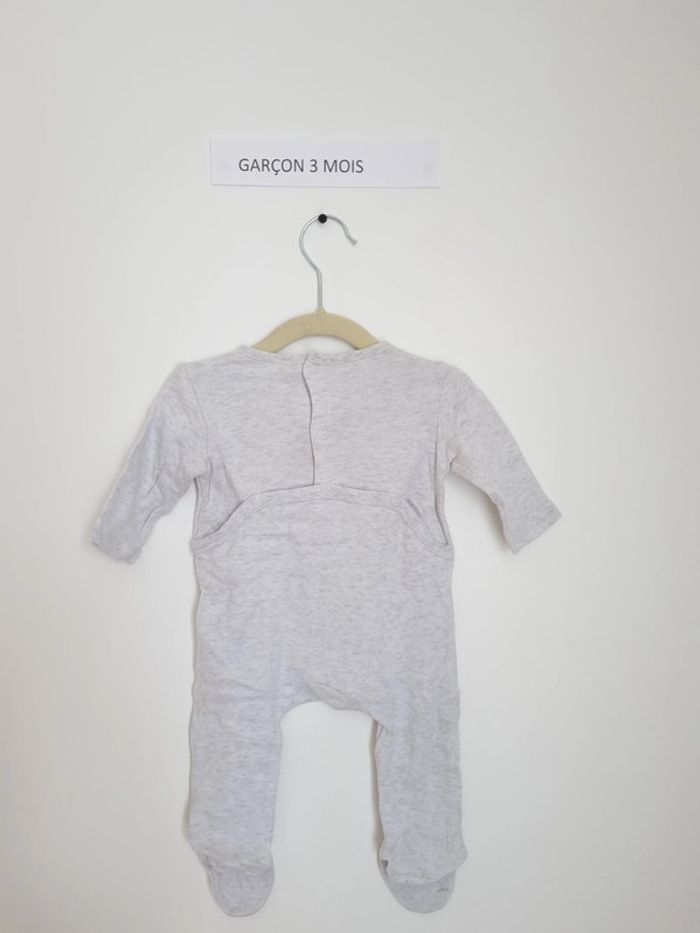Pyjama 1 pièce léger utilisé plusieurs fois mais en très bon état marque tex baby 3 mois fermeture par boutons pression sur l'arrière gris avec motif dinosaure sur le devant plutôt garçon