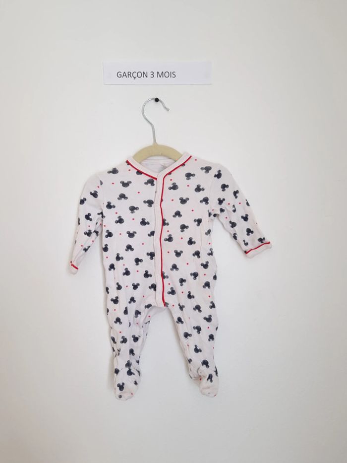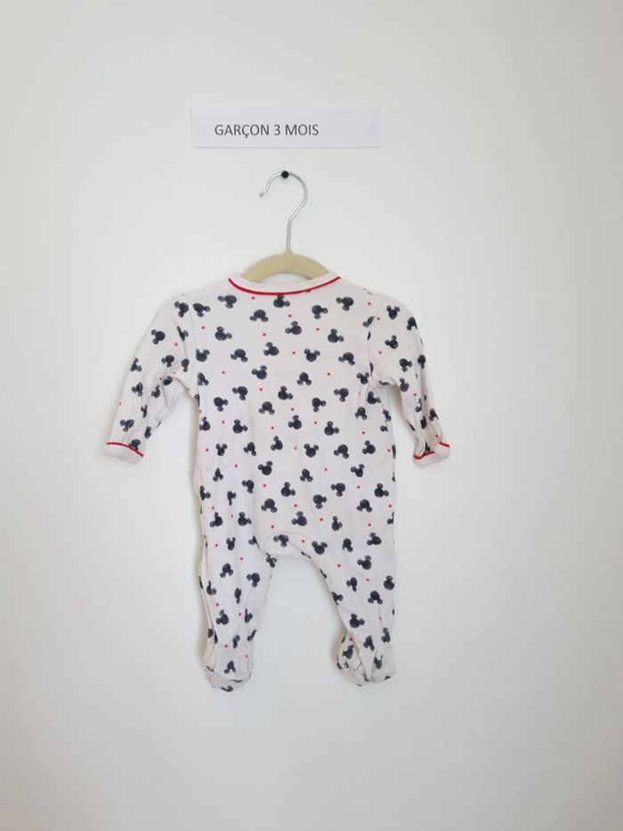 Pyjama 1 pièce léger utilisé plusieurs fois mais en très bon état marque Disney baby par orchestra 3 mois 60 cm fermeture par boutons pression sur l'avant blanc avec liseré rouge, motif bleu mickey mixte