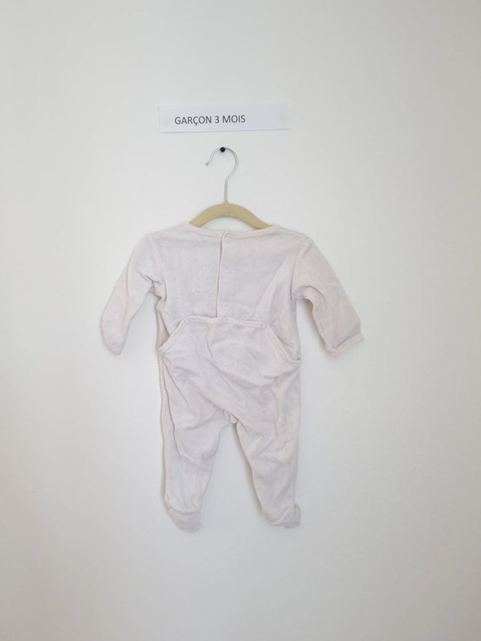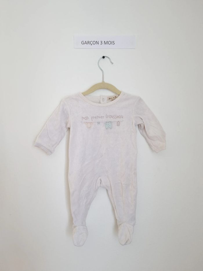 Pyjama 1 pièce chaud utilisé plusieurs fois mais en très bon état marque grain de blé 3 mois 60 cm fermeture par boutons pression sur l'arrière couleur blanc avec inscription "mon premier trousseau" mixte
