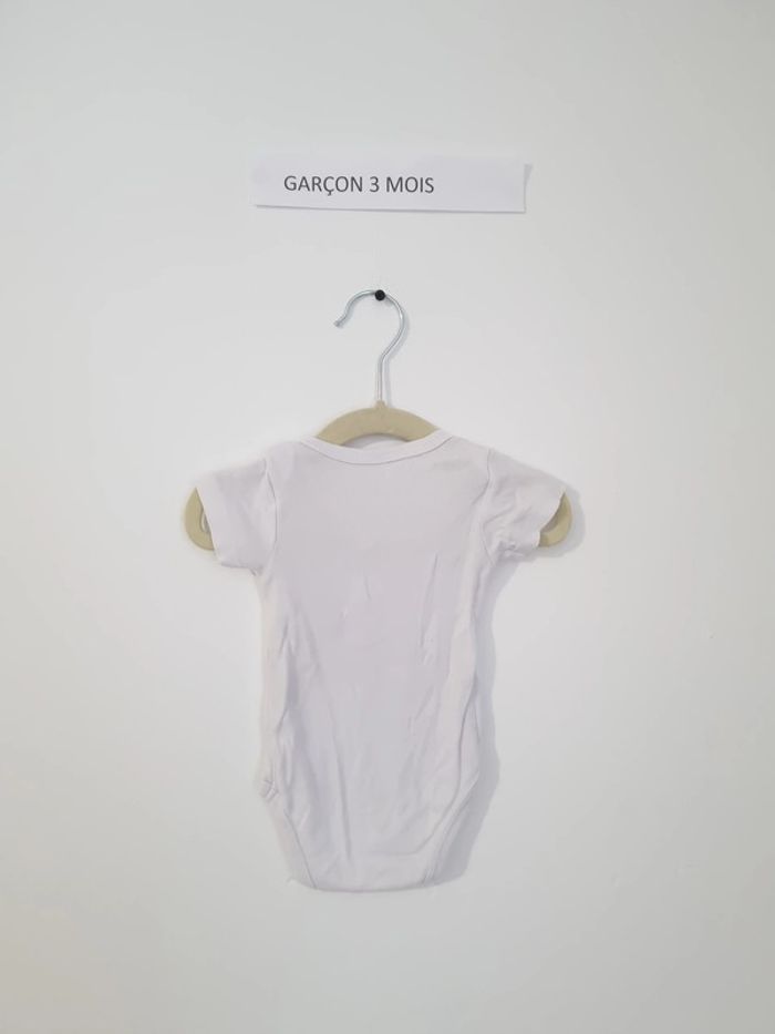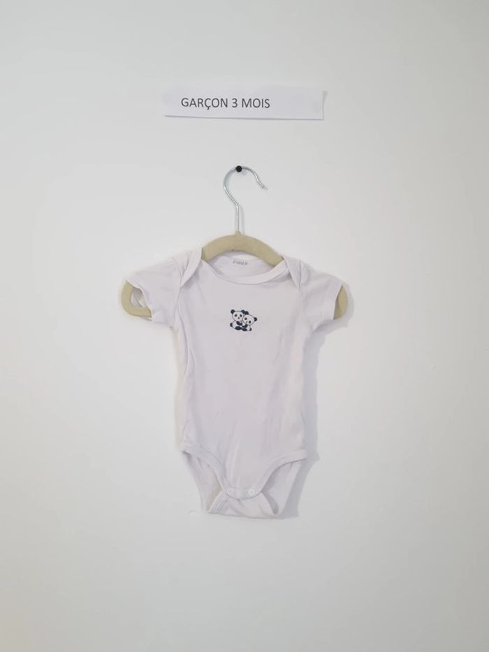 Body manche courtes à enfiler par encolure américaine boutons pressions présent au niveau de l'entre-jambe body blanc avec motif panda portés plusieurs fois mais en très bon état mixte marque kiabi 3 mois