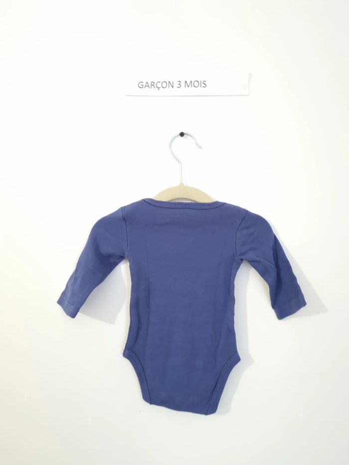Body manche longues à enfiler par encolure américaine boutons pressions présent au niveau de l'entre-jambe body bleu uni avec inscription en jaune "little explorer" portés plusieurs fois mais en très bon état mixte 3 mois 62 cm